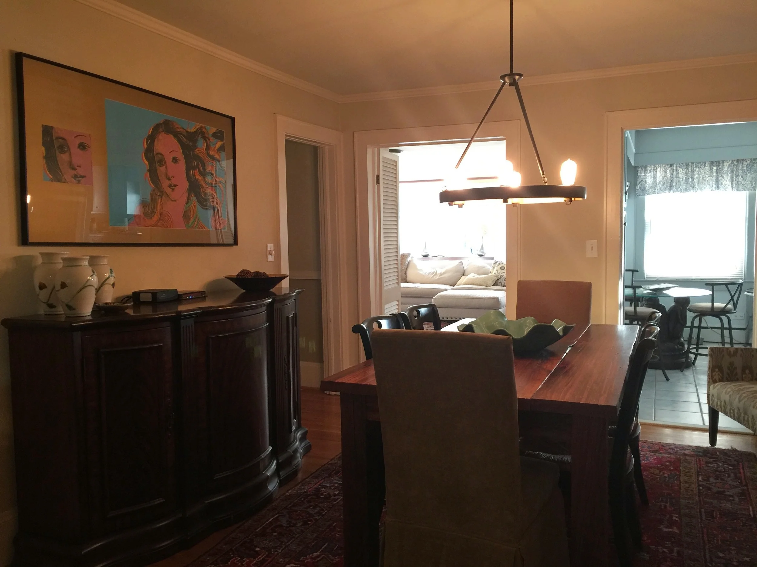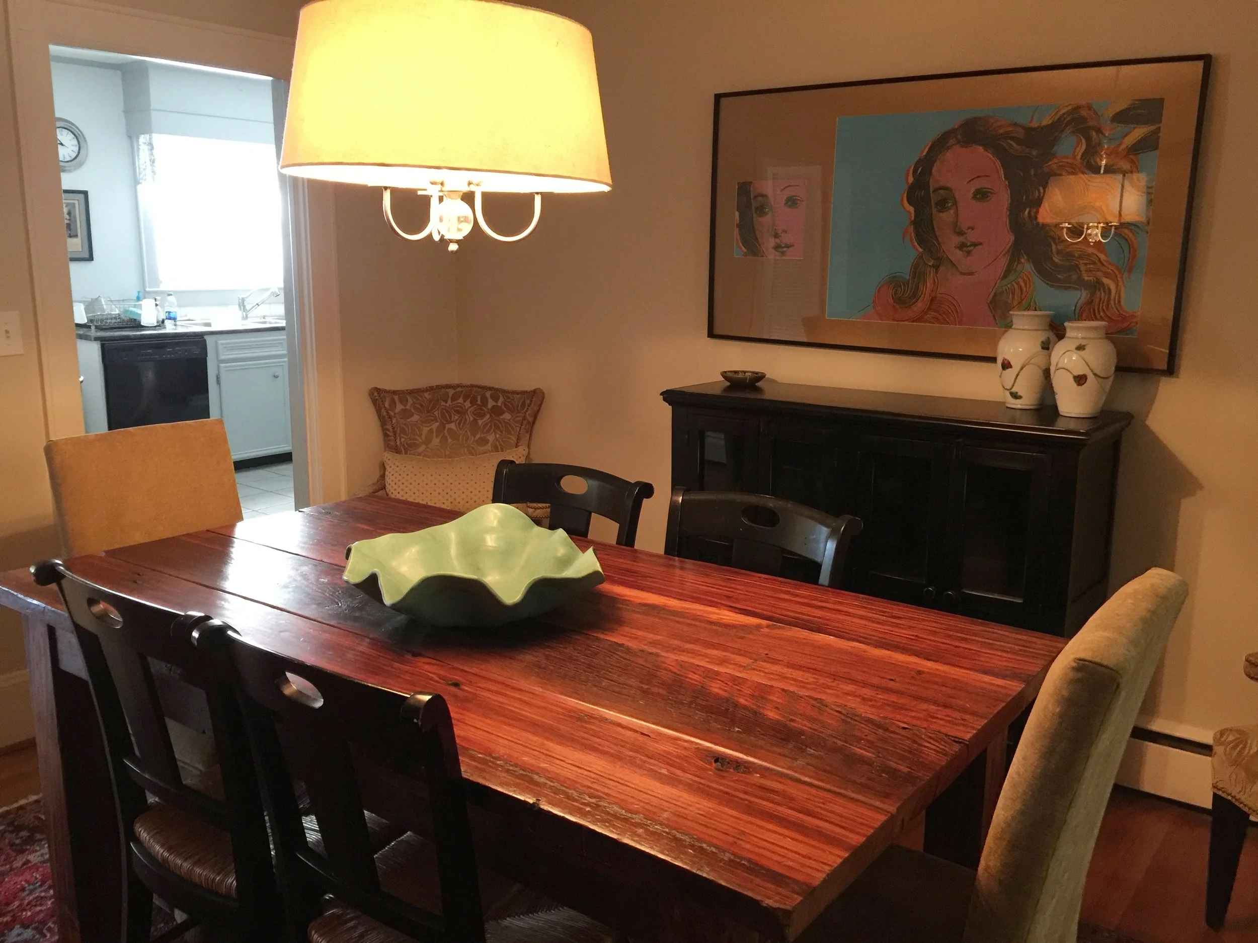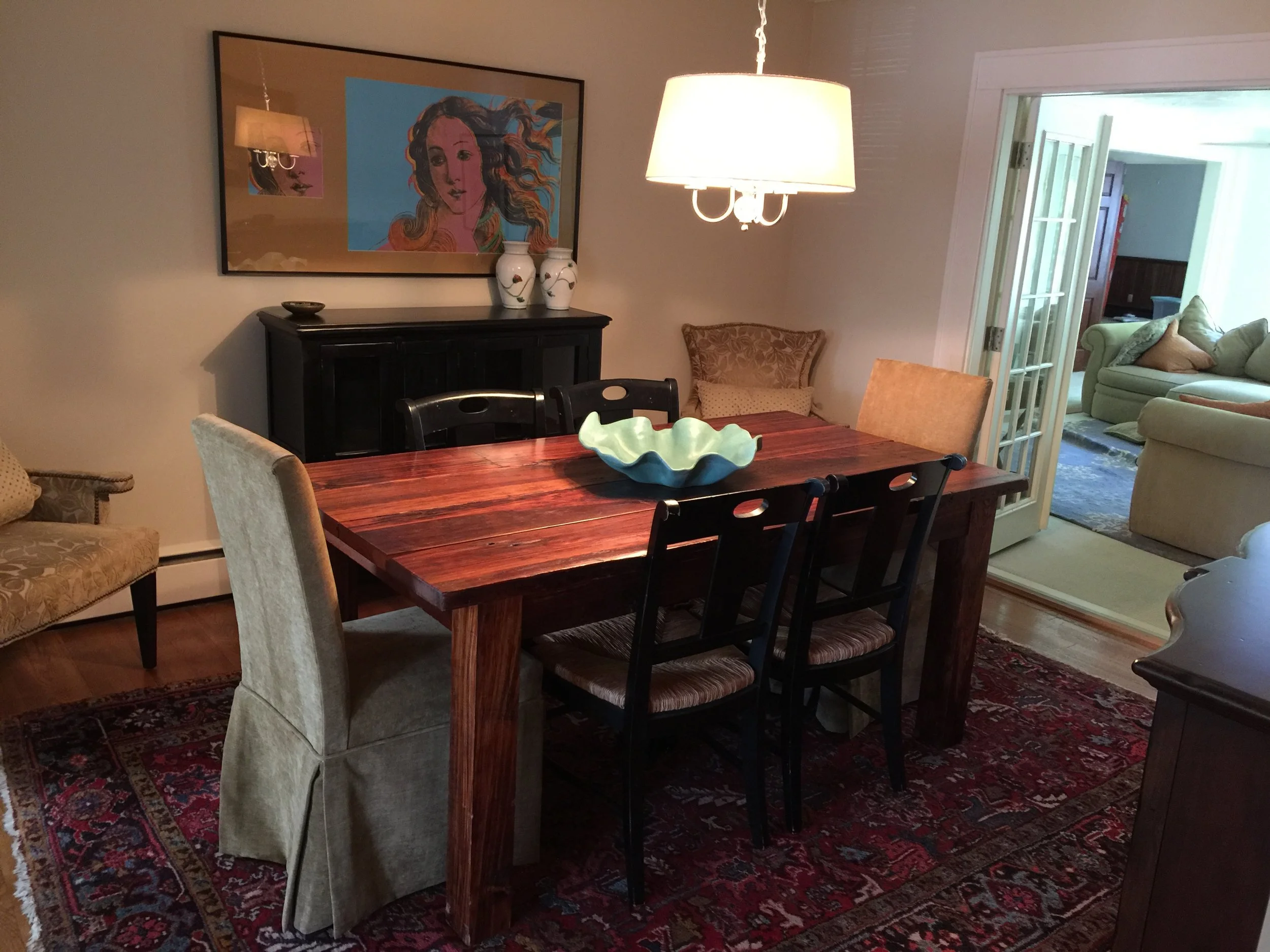 This is our dining room. My favorite pieces in the room are the gorgeous swamp cypress farm table built by hand by Wes and the unsigned Andy Warhol The Birth of Venus print.