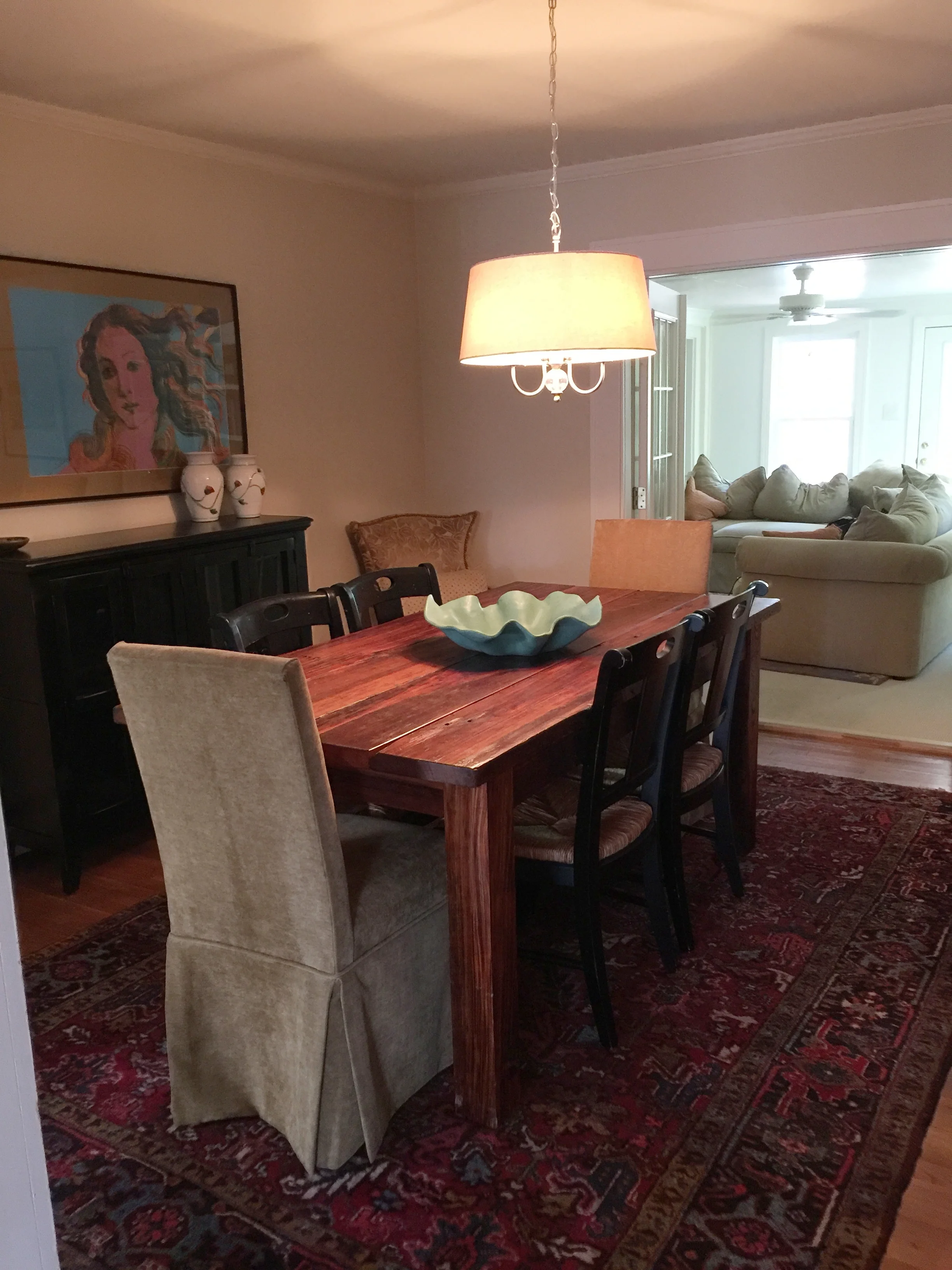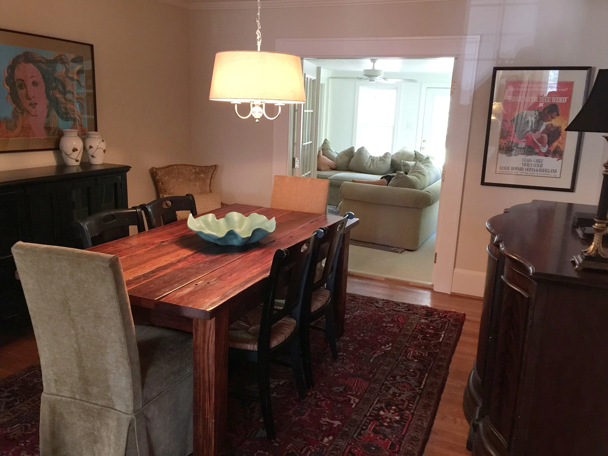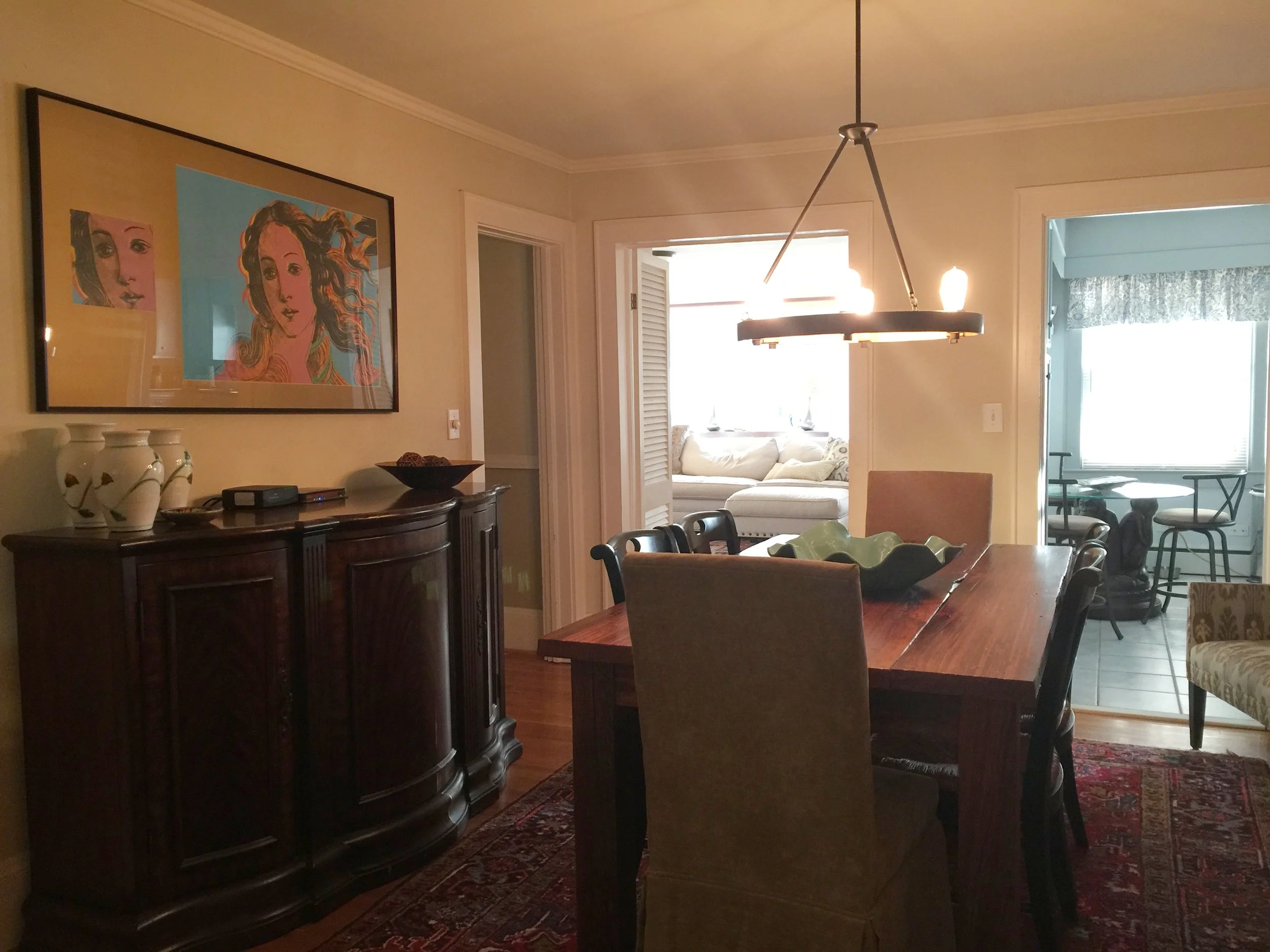 This is our dining room. My favorite pieces in the room are the gorgeous swamp cypress farm table built by hand by Wes and the unsigned Andy Warhol The Birth of Venus print.