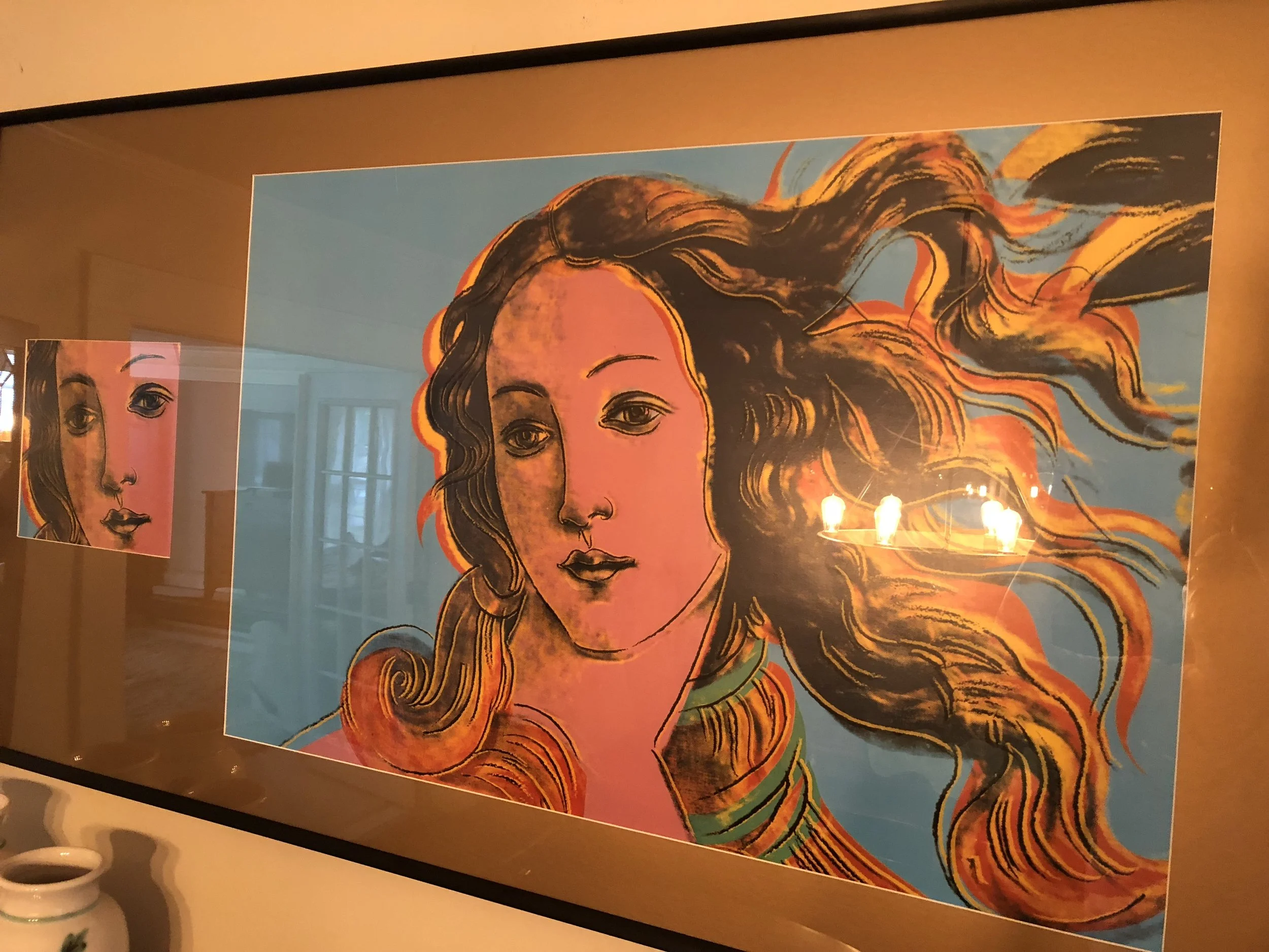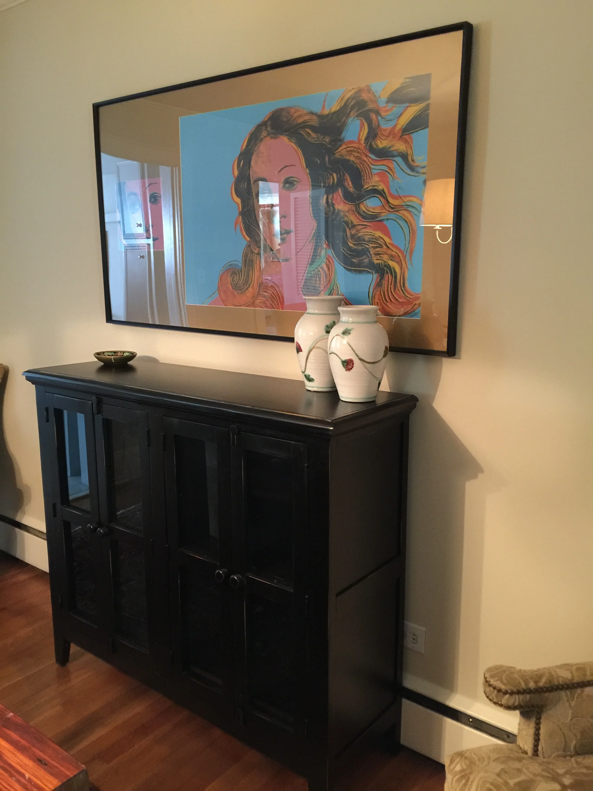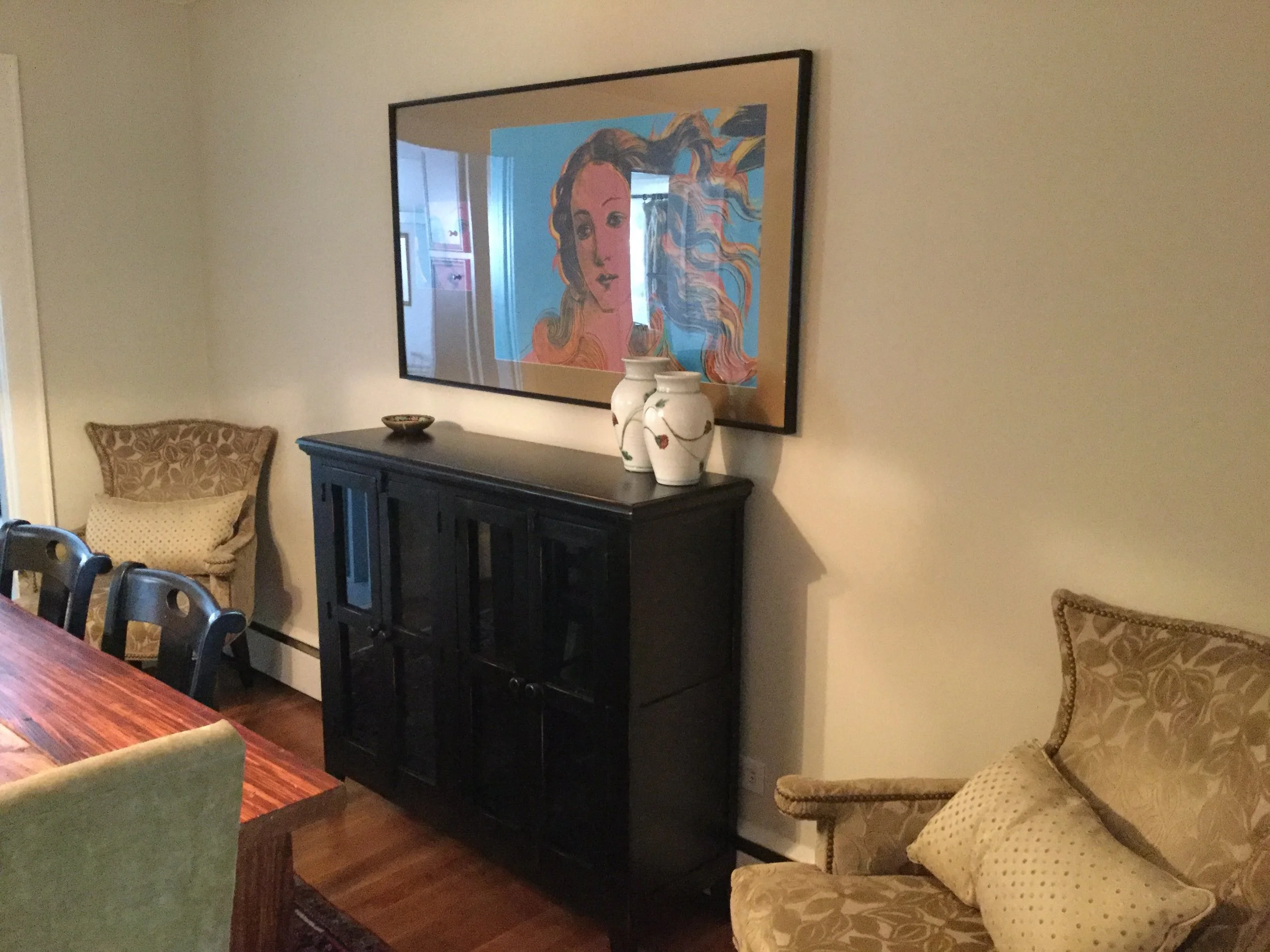 We started out by refinishing the gorgeous swamp cypress farm table that Wes had built entirely by hand, restoring it to its original beauty from swamp cypress he found, cut and prepared by hand. It is the true showpiece of the room and always will be. The other piece that has pride of place is the authentic (yet unsigned) Andy Warhol The Birth of Venus print I found. I love The Birth of Venus by Sandro Botticelli and this is the closest I will ever get to it. It wasn't actually printed by Andy Warhol himself, but by his assistants, and is unsigned, so it is not valuble, but I love it. There were originally two prints I wanted to hang side by side since Andy Warhol displayed in multiples but one got damaged, so I framed a fragment of it along with the intact print. I am very proud of my Warhol print. It is my first foray into collecting art, such as it is.