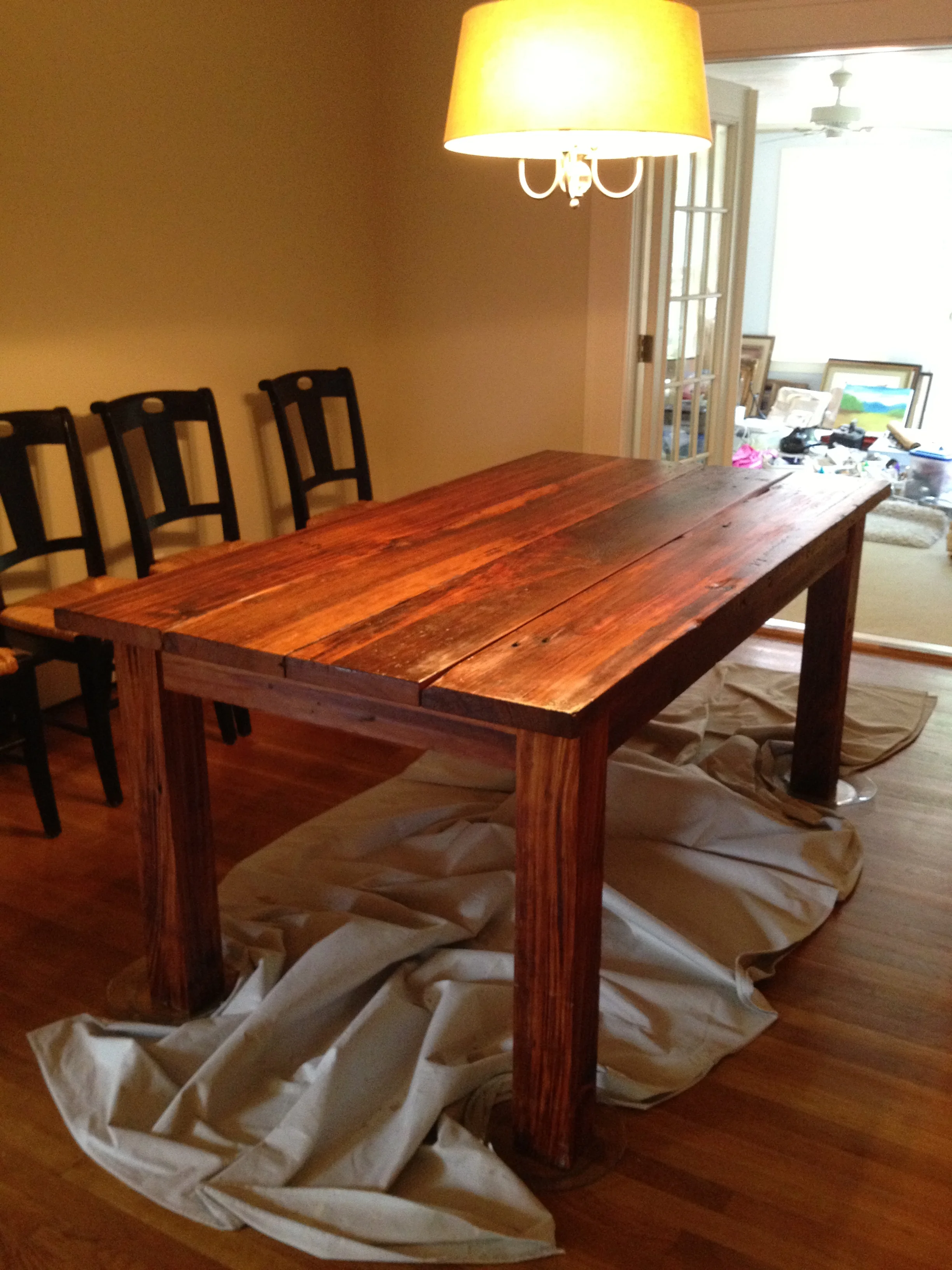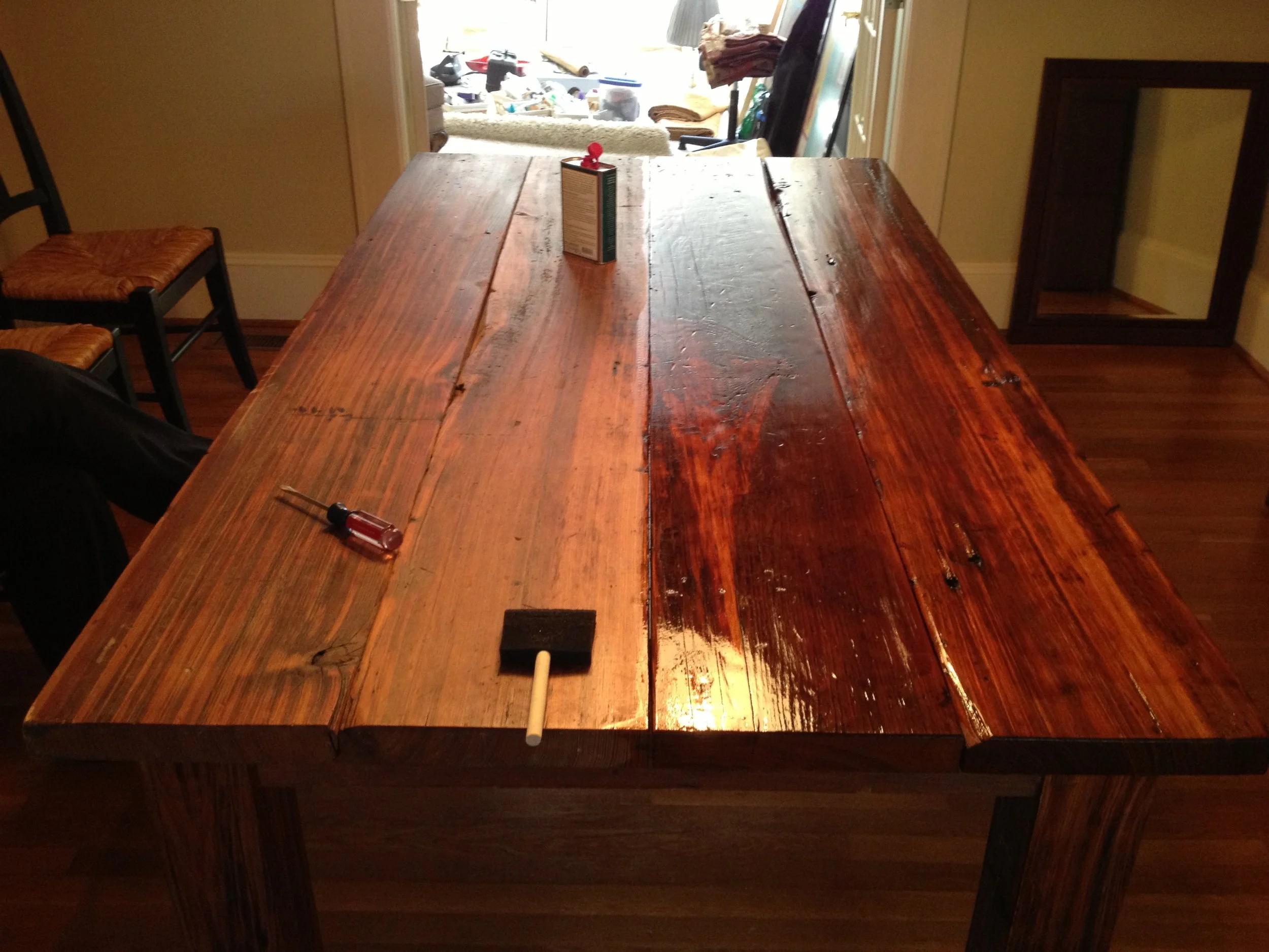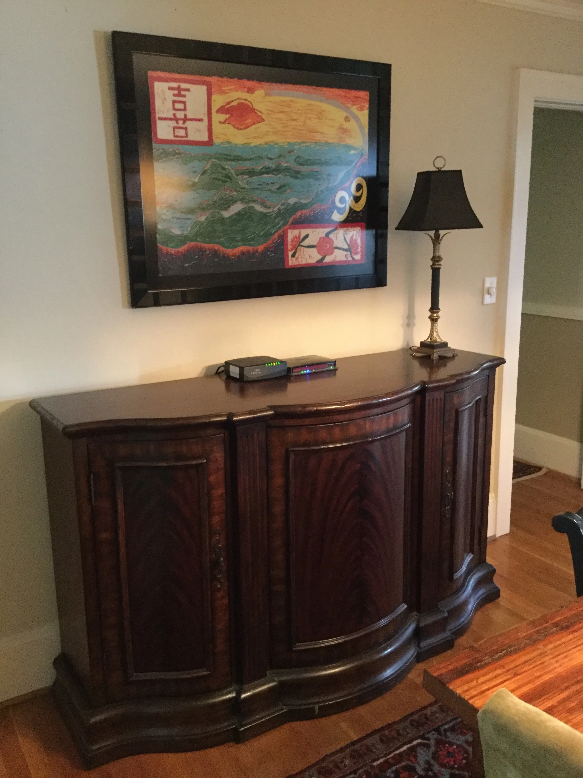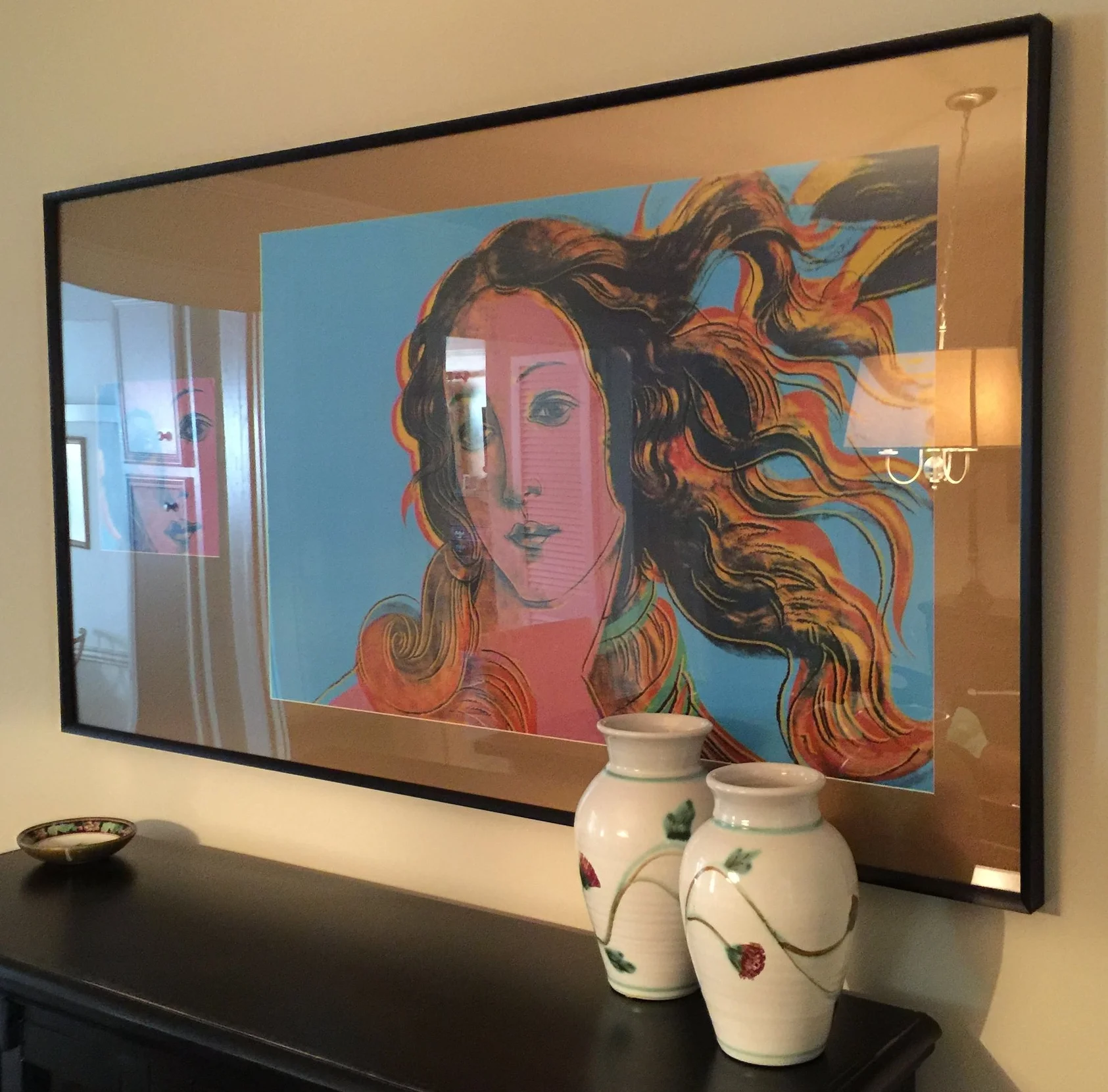 We started out by refinishing the gorgeous swamp cypress farm table that Wes had built entirely by hand, restoring it to its original beauty from swamp cypress he found, cut and prepared by hand. It is the true showpiece of the room and always will be. The other piece that has pride of place is the authentic (yet unsigned) Andy Warhol The Birth of Venus print I found. I love The Birth of Venus by Sandro Botticelli and this is the closest I will ever get to it. It wasn't actually printed by Andy Warhol himself, but by his assistants, and is unsigned, so it is not valuble, but I love it. There were originally two prints I wanted to hang side by side since Andy Warhol displayed in multiples but one got damaged, so I framed a fragment of it along with the intact print. I am very proud of my Warhol print. It is my first foray into collecting art, such as it is.