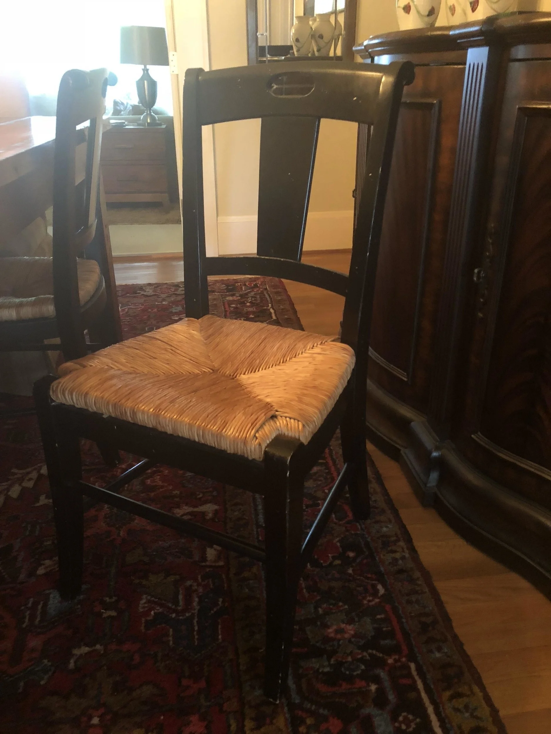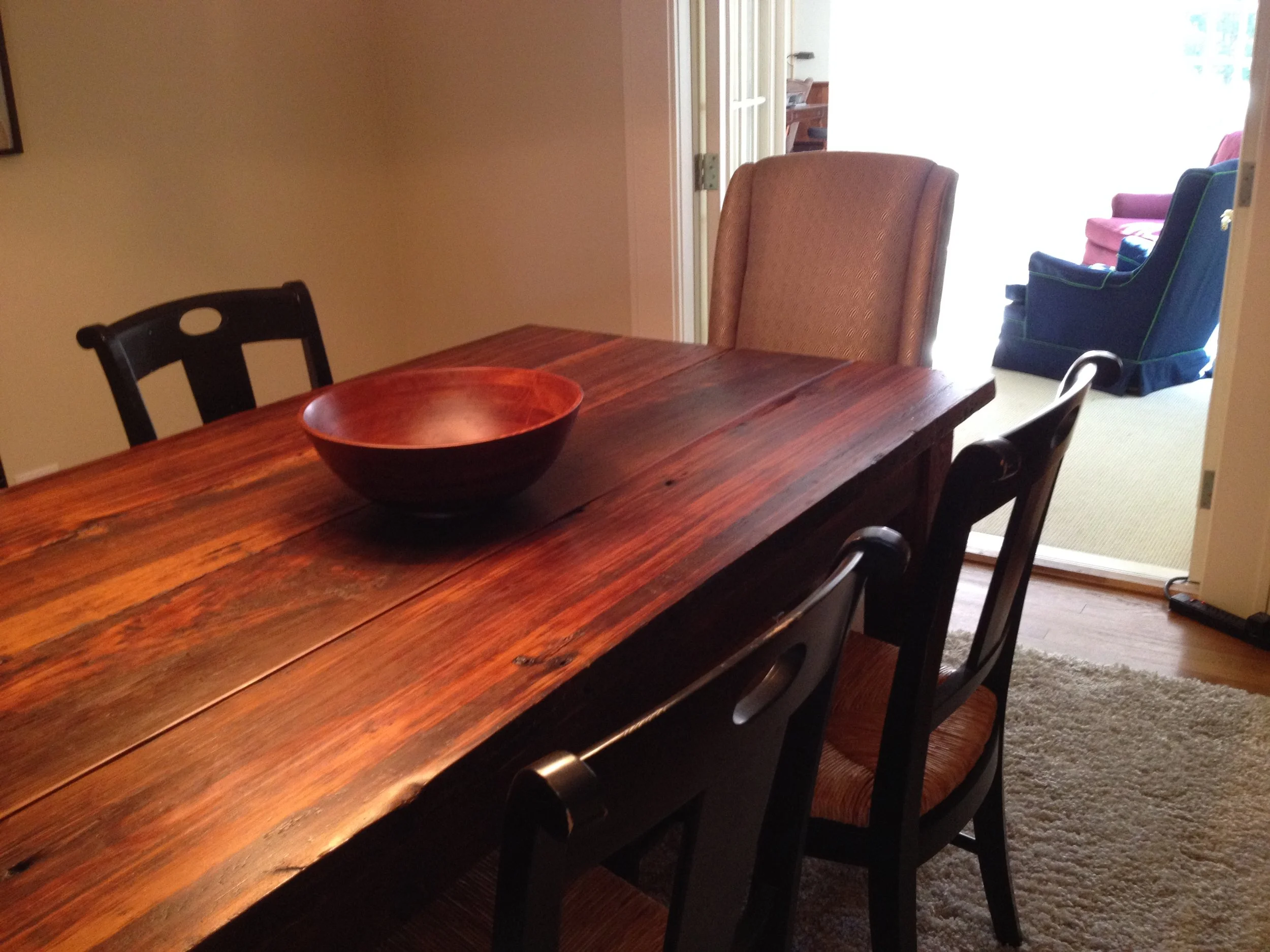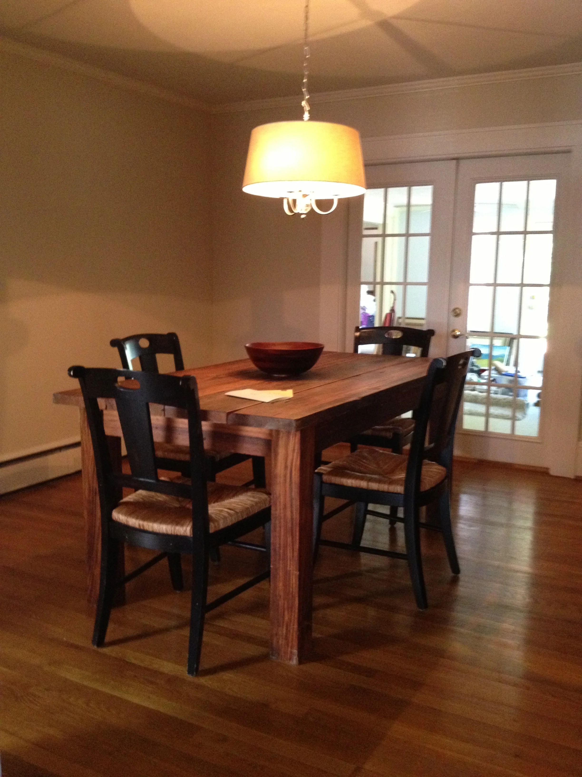 All we had to go with it at first were four distressed black Crate & Barrel chairs with reed bottoms that I had gotten off eBay and picked up in Dallas when I was traveling through to drop off my son at his dad's and hauled back (originally to Alabama) in the back of my pickup truck. we added two gold chairs that Wes found at Tuesday Morning. We added the only rug we had, an off white shag rug I had previously bought from Lowe's.