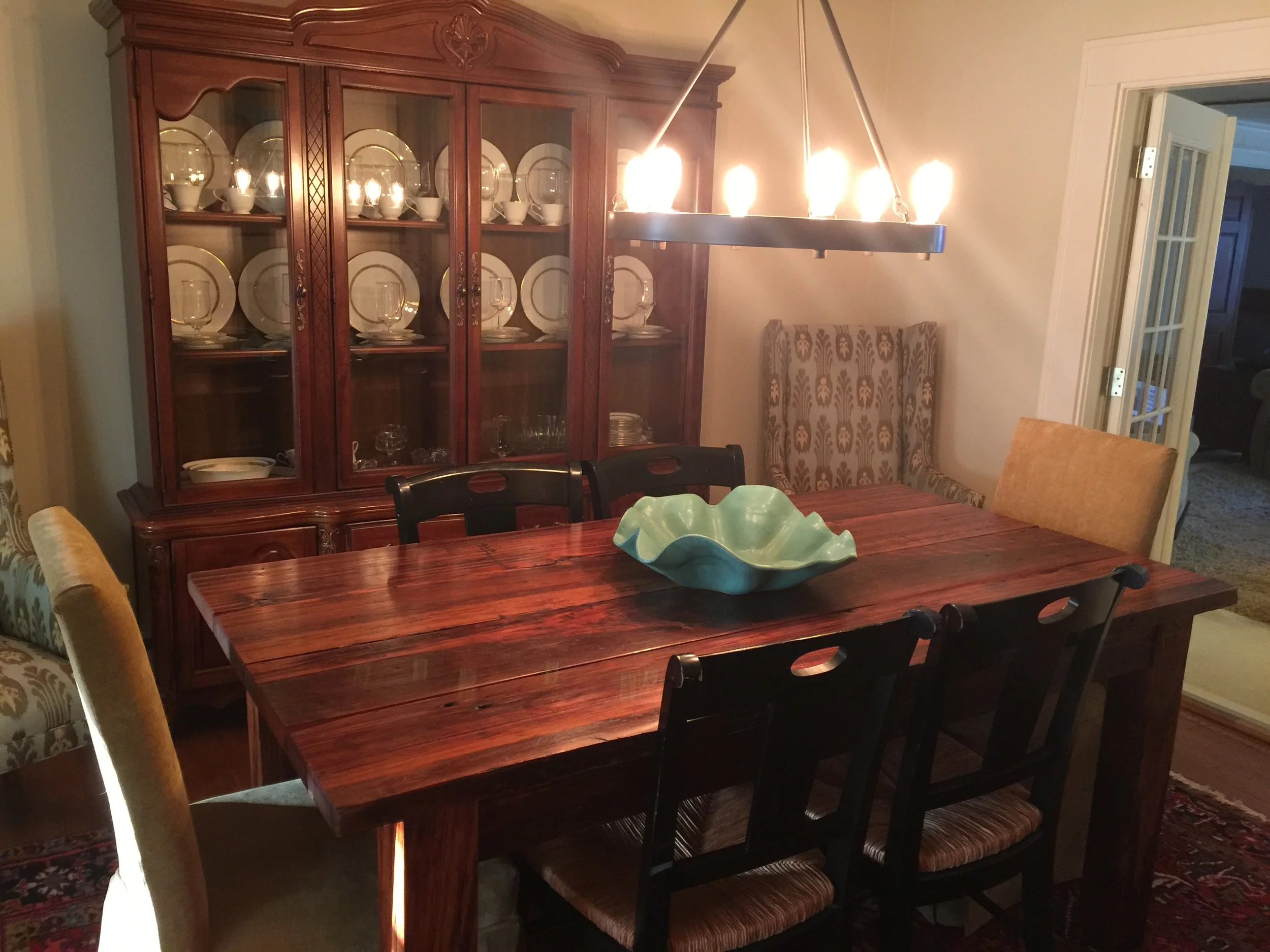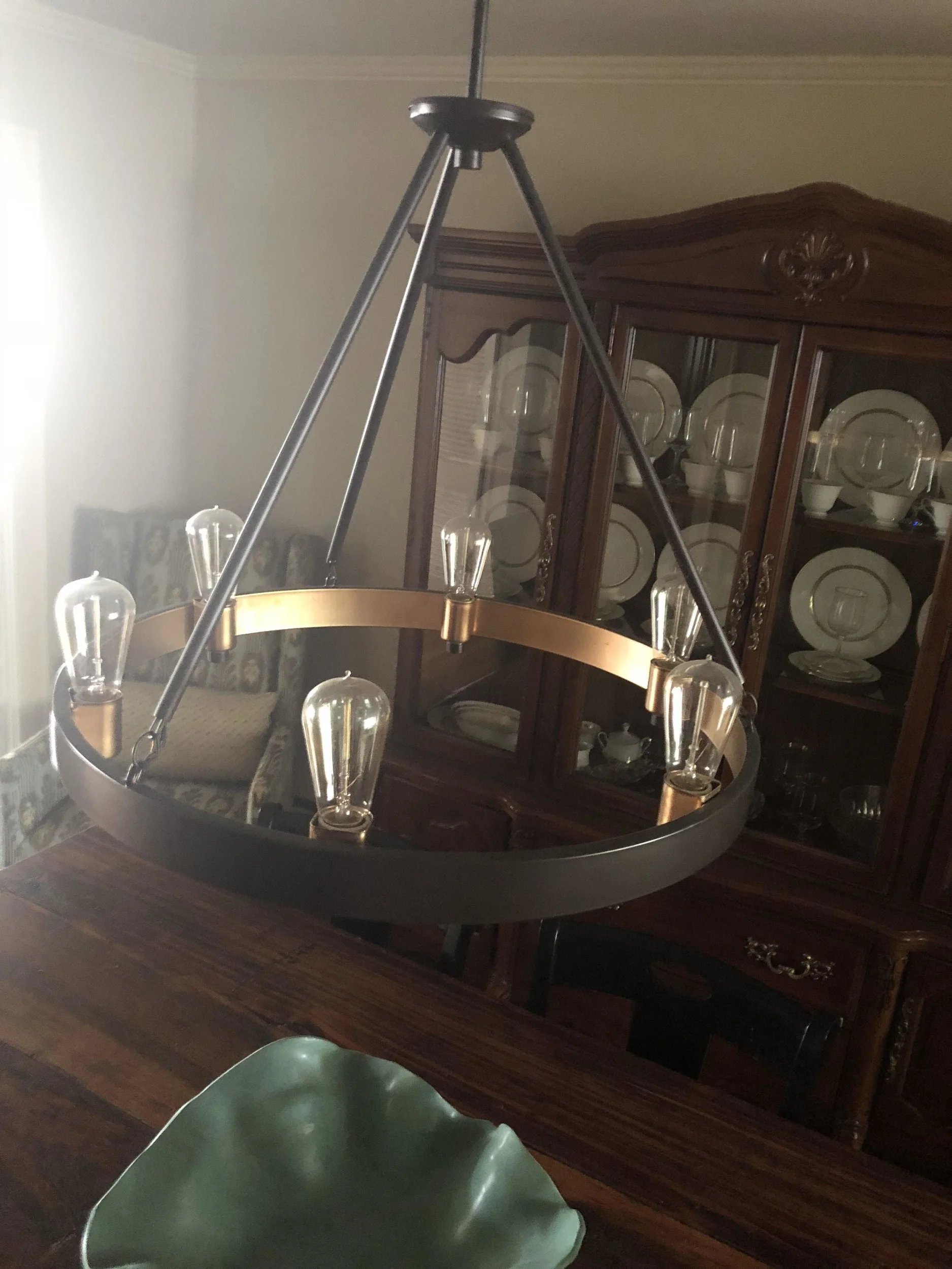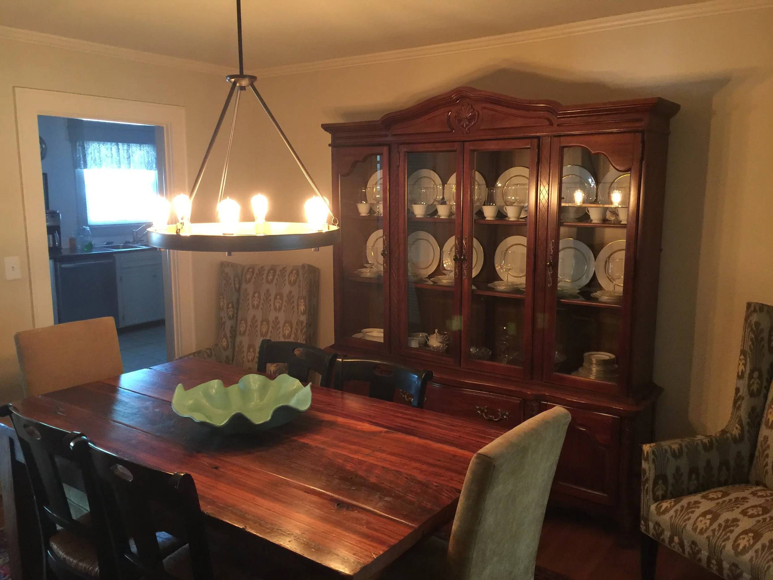 The turquoise bowl was a gift from my brother and his wife. The trio of vases are from master potter Tom Jones in Fairhope, Alabama, that I bought when I lived there. The glass bowl is my mother's. The pair of Lee chairs were also found on Craigslist. Mom couldn't see well in the dining room, so we purchased a new rustic black chandelier with Edison bulbs and gold trim from Lowe's (which was just as well as I truly hated the original one).