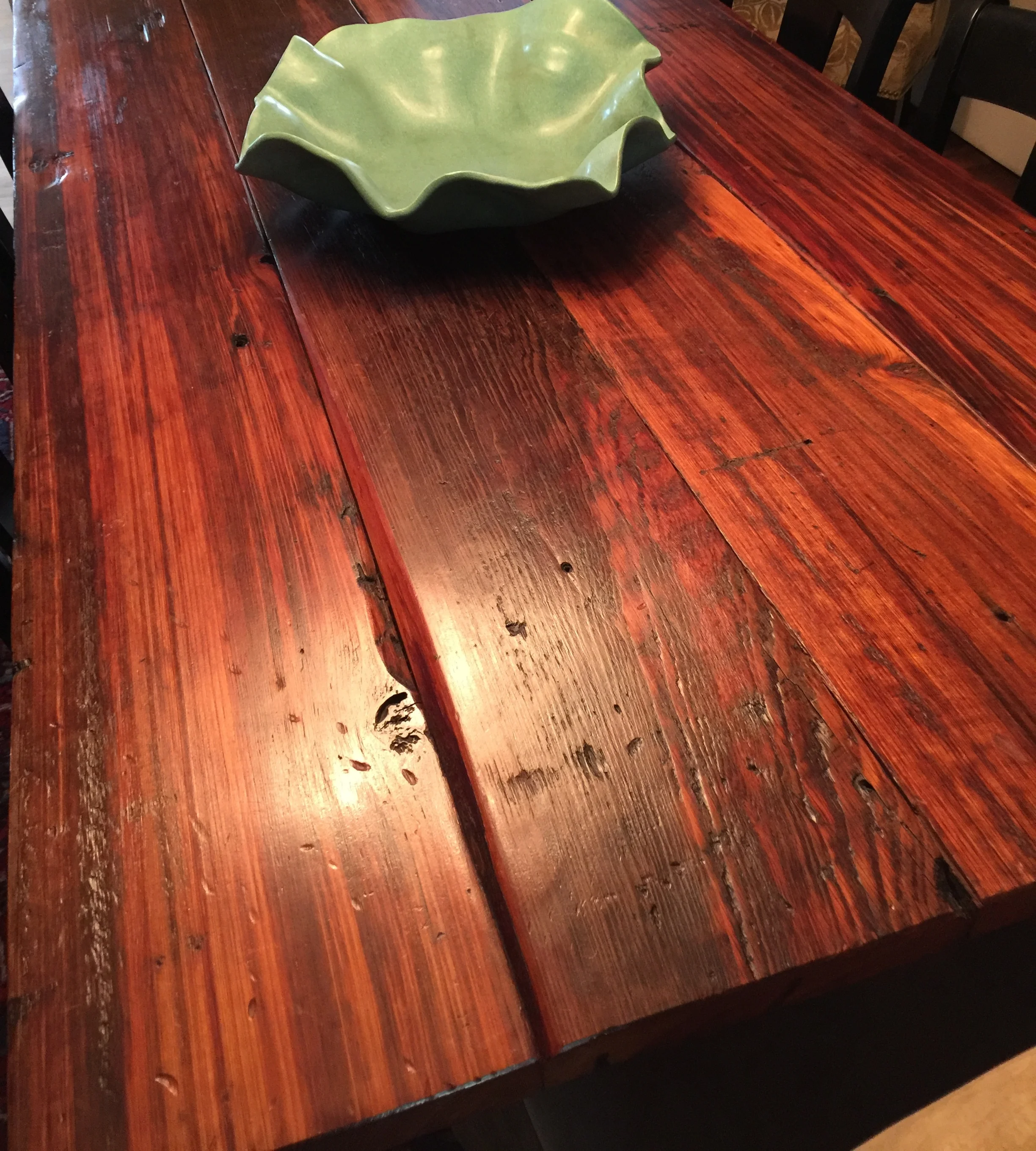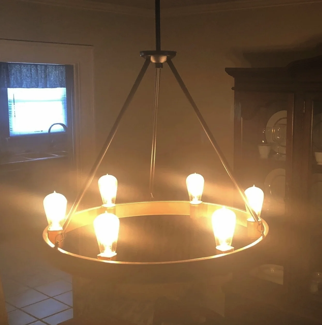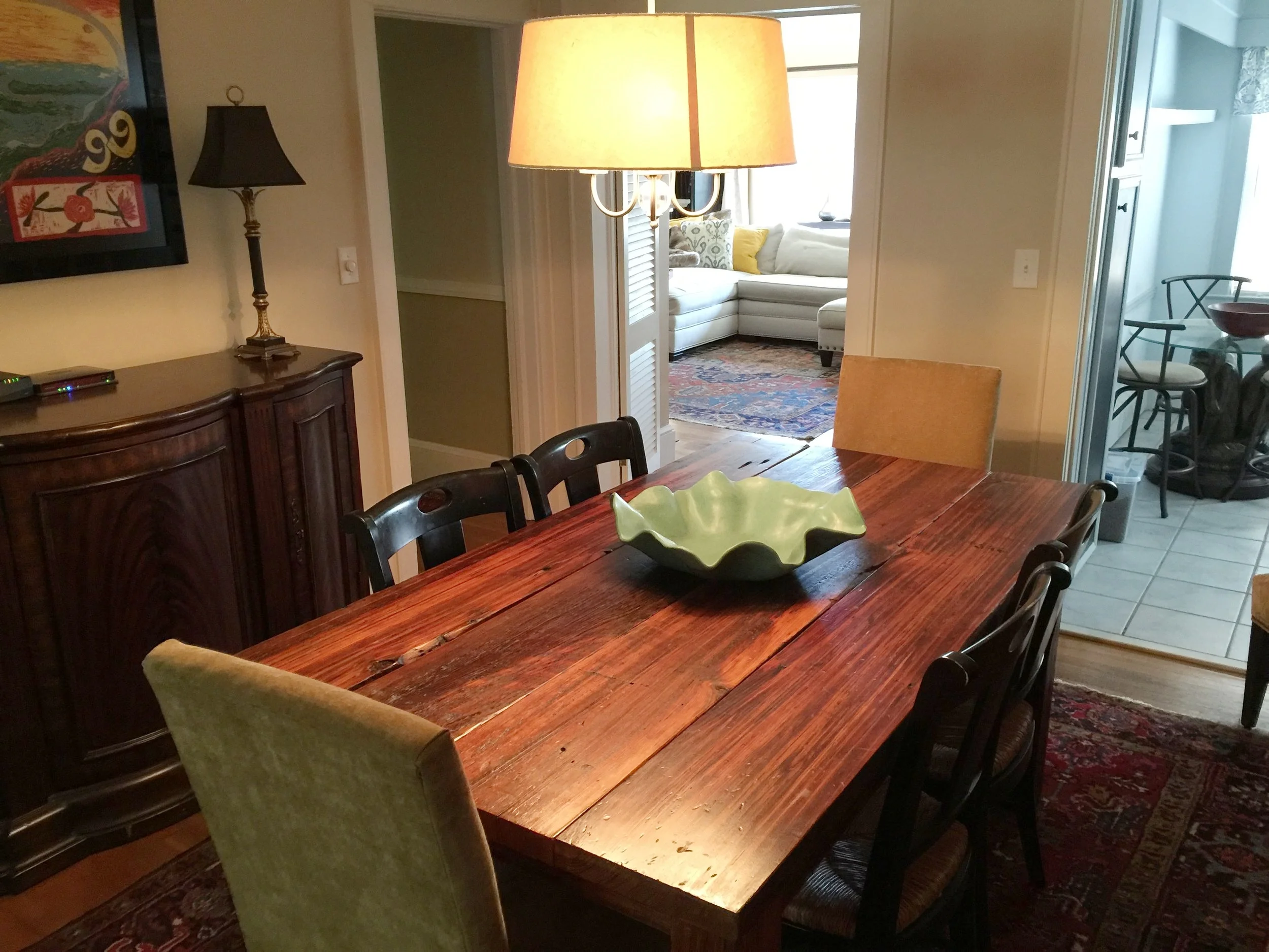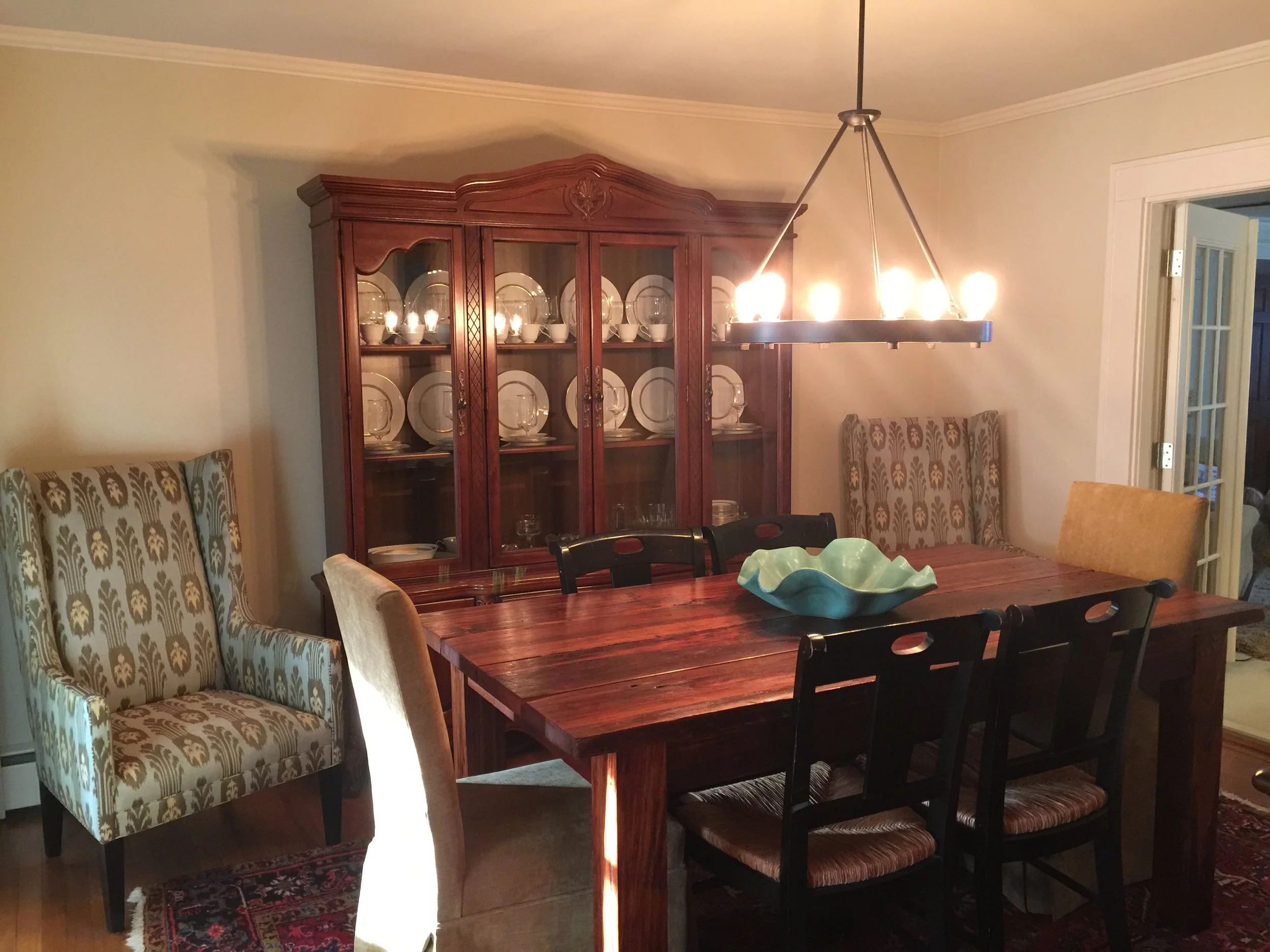The turquoise bowl was a gift from my brother and his wife. The trio of vases are from master potter Tom Jones in Fairhope, Alabama, that I bought when I lived there. The glass bowl is my mother's. The pair of Lee chairs were also found on Craigslist. Mom couldn't see well in the dining room, so we purchased a new rustic black chandelier with Edison bulbs and gold trim from Lowe's (which was just as well as I truly hated the original one).