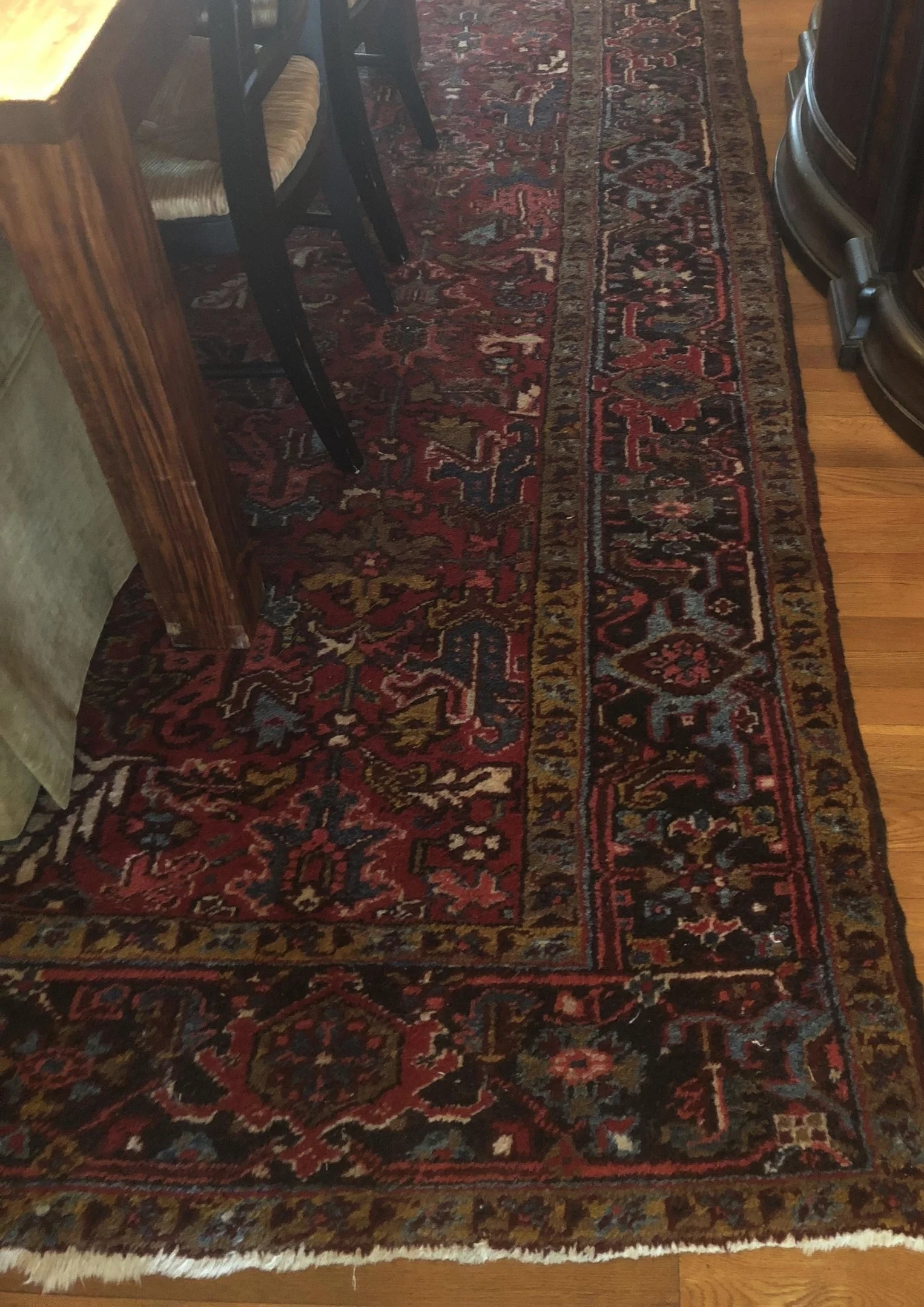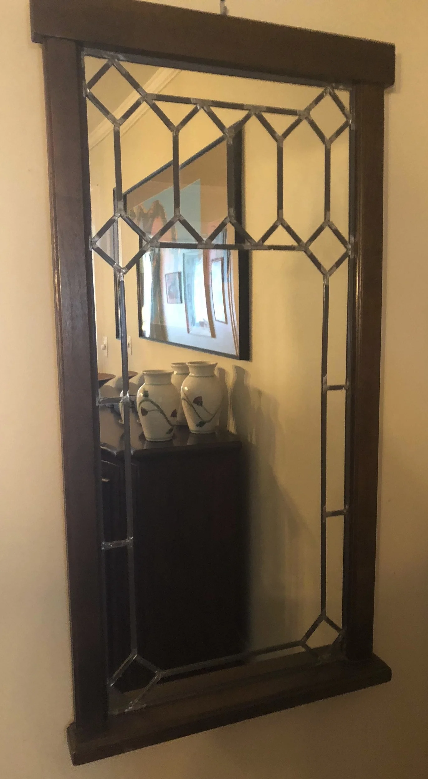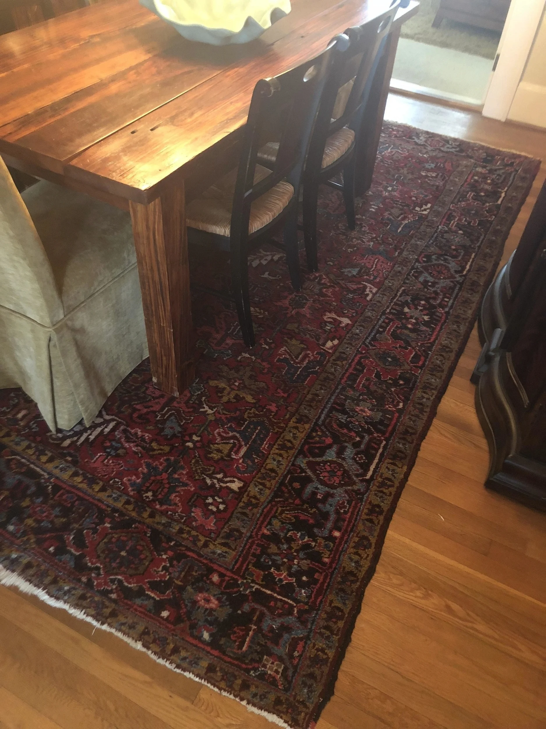 We later added a black glass front cabinet that I later moved to my office and tried the gold brocade chairs found on Craigslist that I later moved to my office as well. Wes found the bar at a damaged freight store that he was very proud of, although it stays mostly empty. We found the qntique Heriz Persian rug on eBay, along with a Heriz runner for the hallway, and retired the shag rug to a bedroom. When my widowed mother moved in with me after Wes passed away, I found a china cabinet on Craigslist to hold all of her china and crystal for there was no room for it anywhere else. We also hung her vintage rustic leaded glass mirror that always hung in our home in MIssissippi as I was growing up.