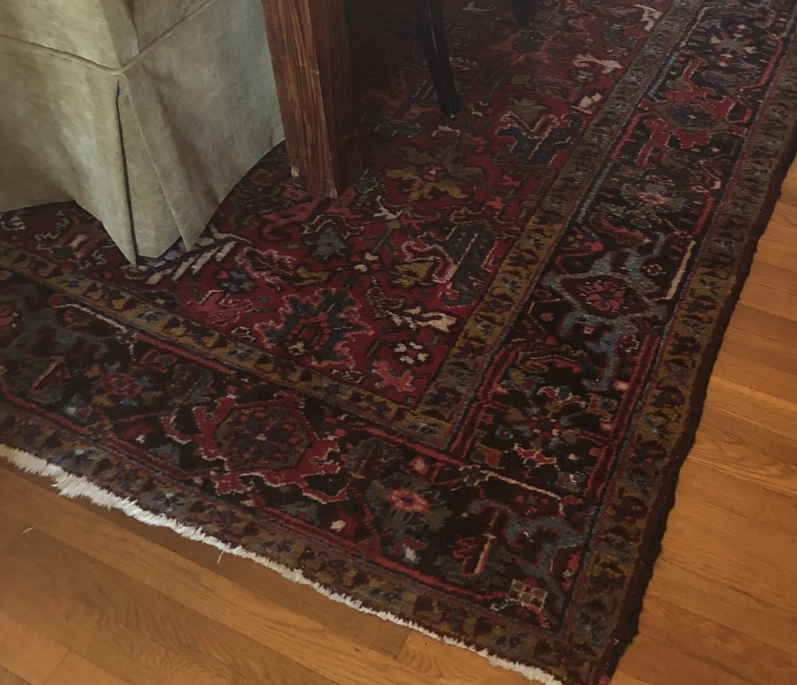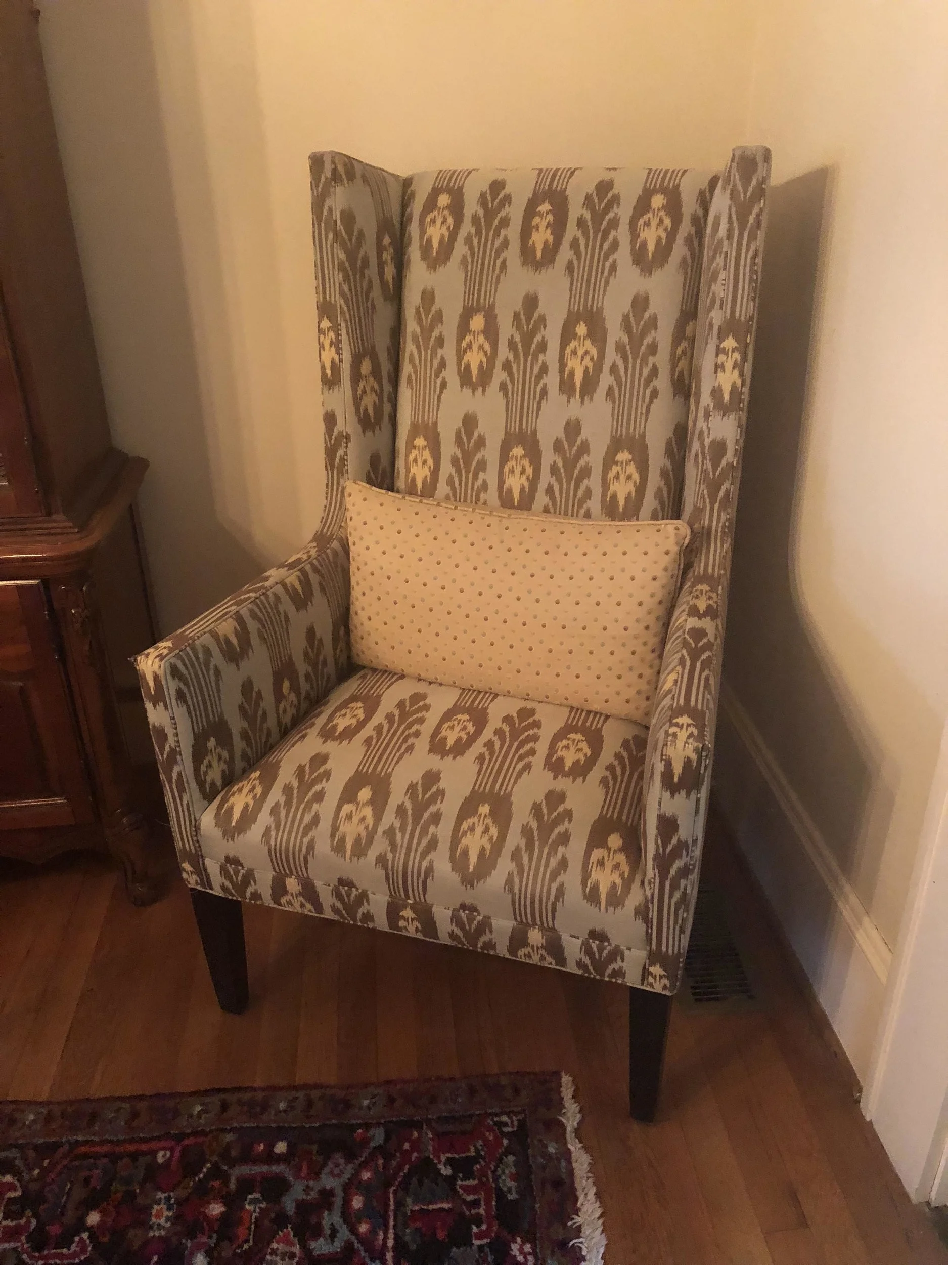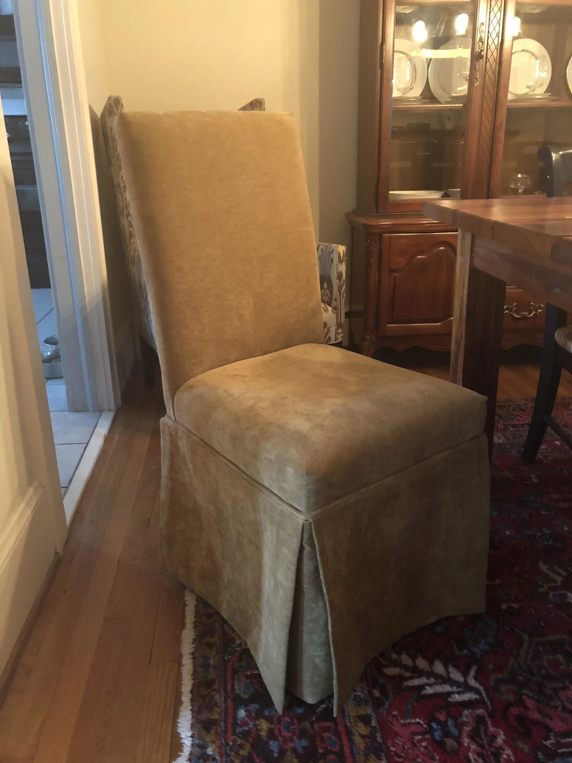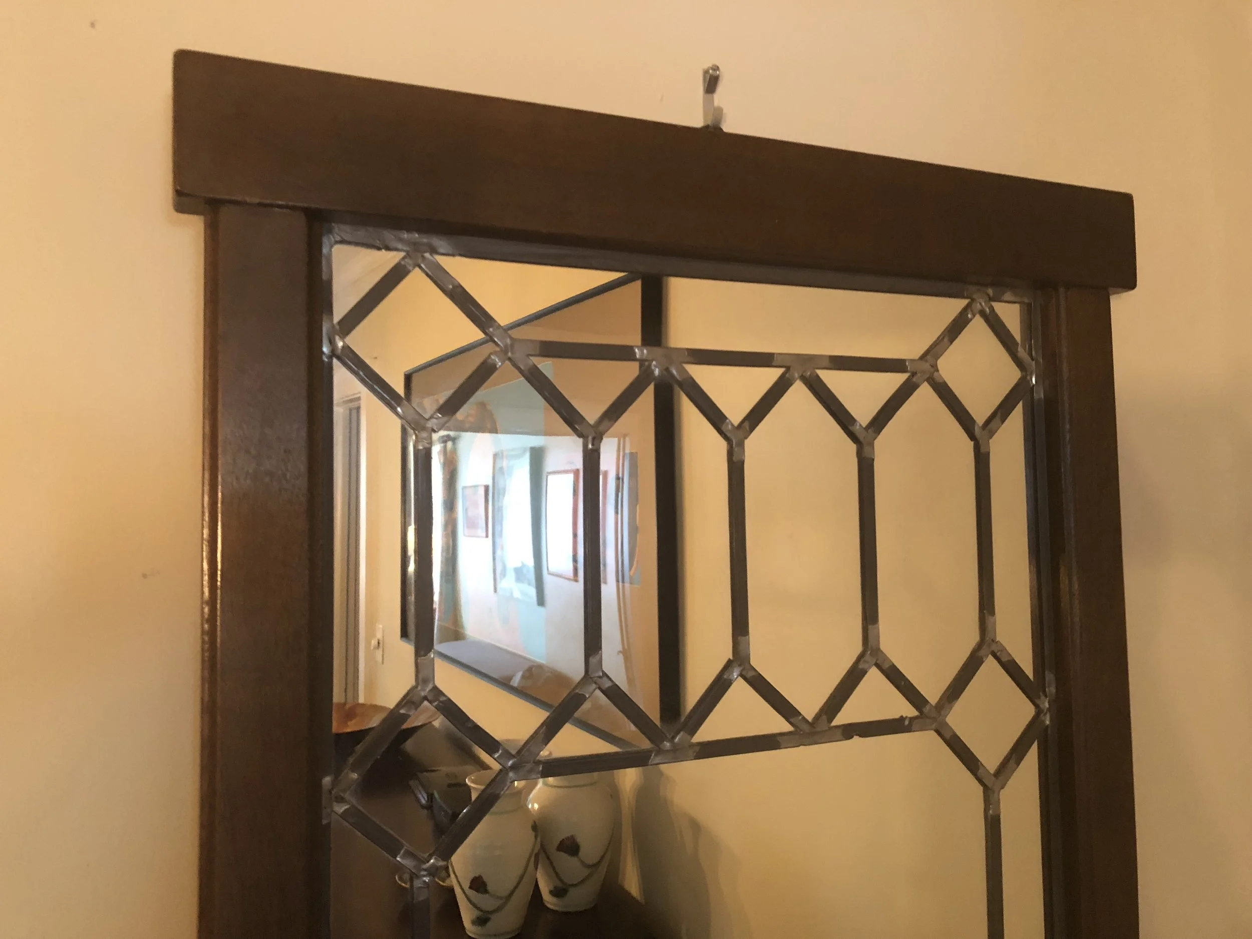 We later added a black glass front cabinet that I later moved to my office and tried the gold brocade chairs found on Craigslist that I later moved to my office as well. Wes found the bar at a damaged freight store that he was very proud of, although it stays mostly empty. We found the qntique Heriz Persian rug on eBay, along with a Heriz runner for the hallway, and retired the shag rug to a bedroom. When my widowed mother moved in with me after Wes passed away, I found a china cabinet on Craigslist to hold all of her china and crystal for there was no room for it anywhere else. We also hung her vintage rustic leaded glass mirror that always hung in our home in MIssissippi as I was growing up.