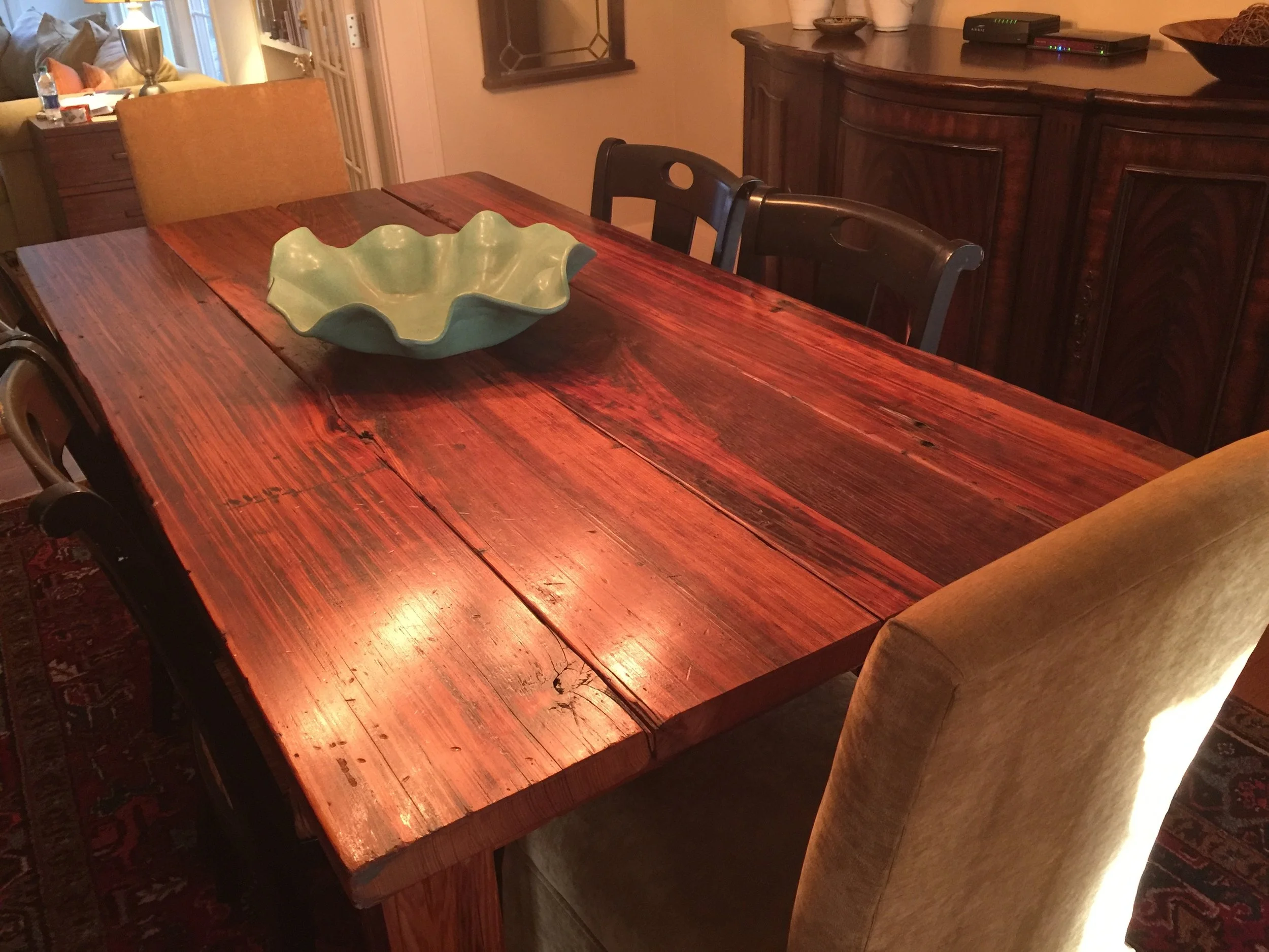This is our dining room. My favorite pieces in the room are the gorgeous swamp cypress farm table built by hand by Wes and the unsigned Andy Warhol The Birth of Venus print. The room has been changing since we moved in, and it is still being refined as I can afford to make the changes I want to make.