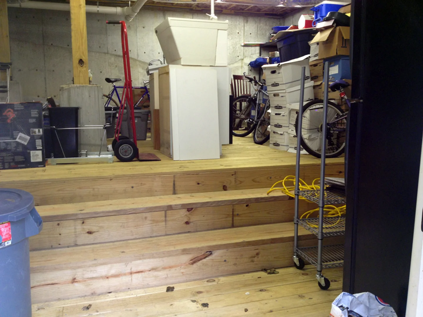 We also completely renovated the basement crawlspace, from a large unnavigable dirt hole into over 1,400 square feet of usable storage underneath the basement level, with the innovative solution to dig out the dirt and rock and level it in order to add a weather-treated wood floor, installed much like decking (instead of pouring concrete, which would have been cost-prohibitive).