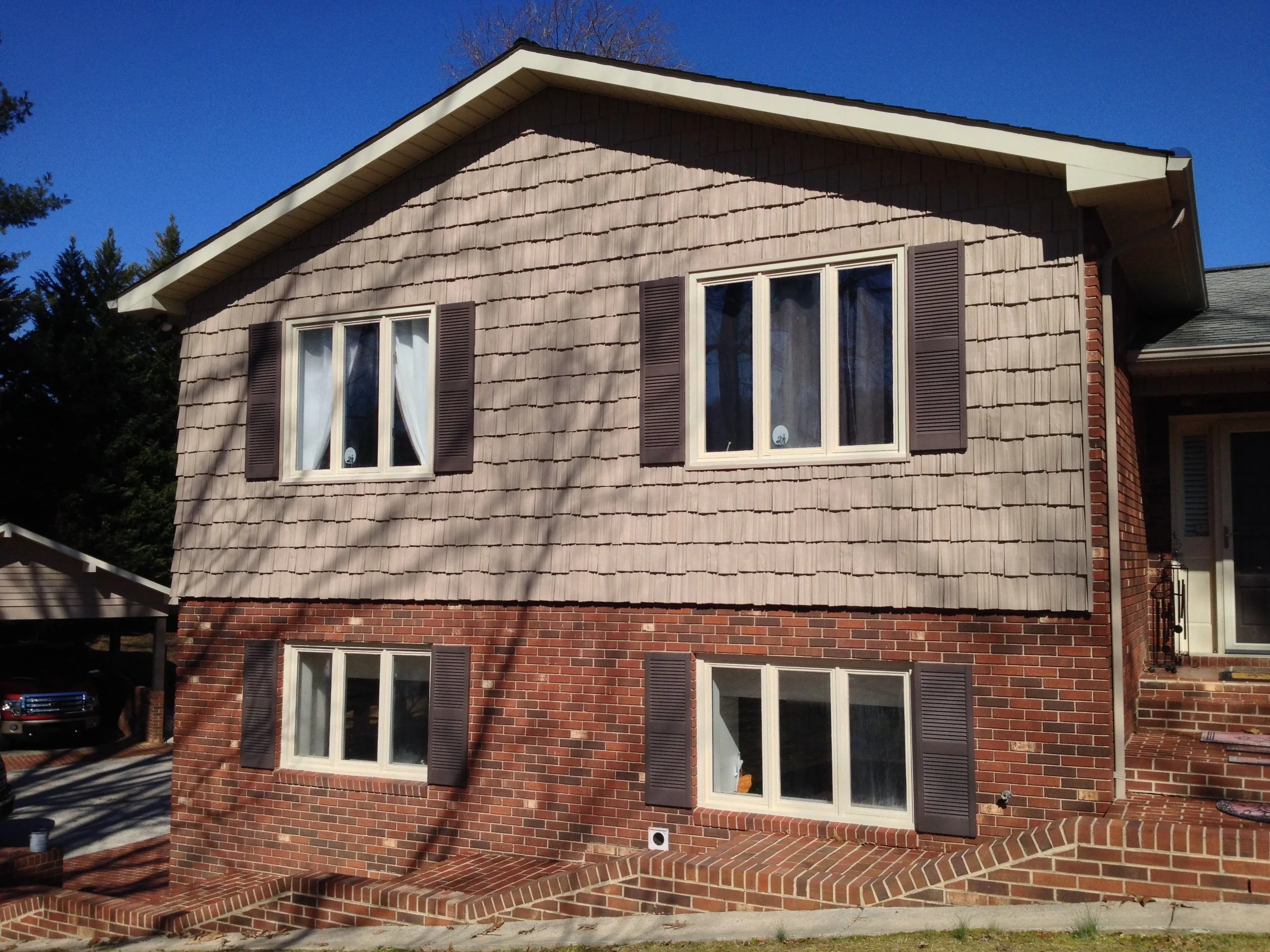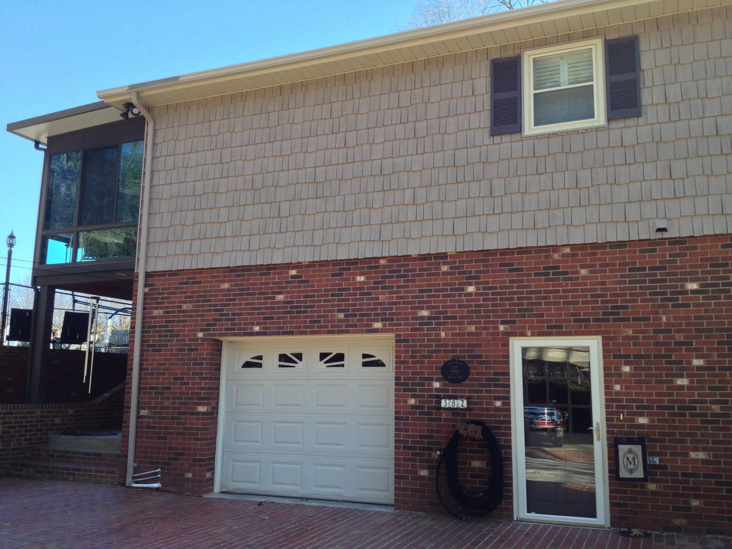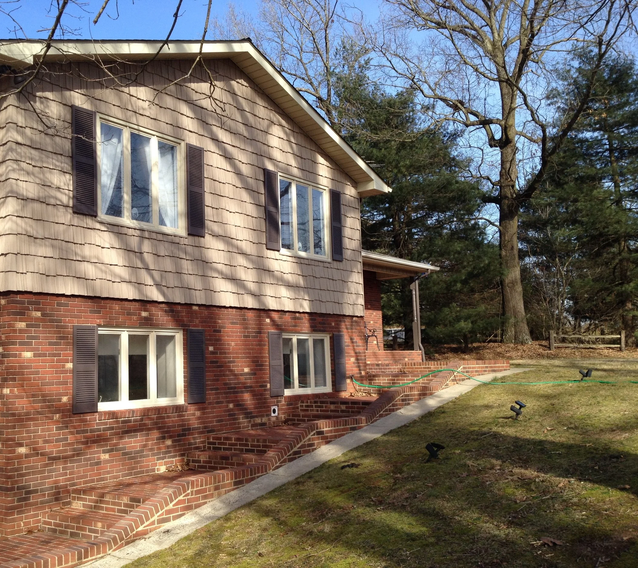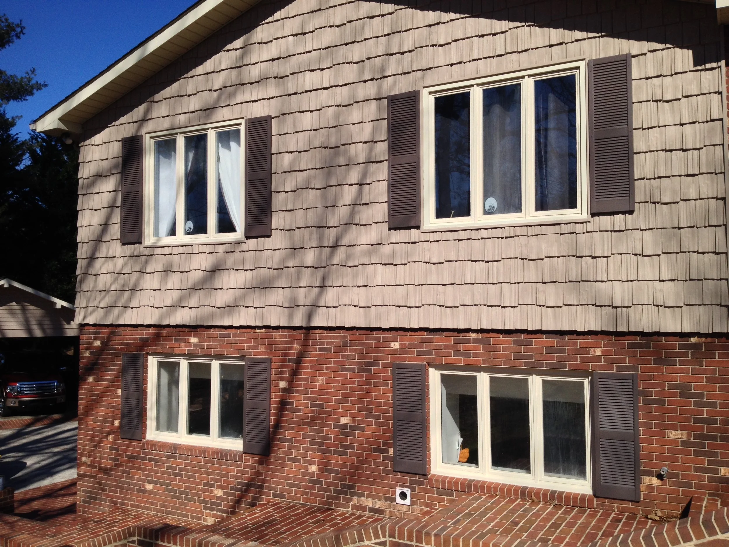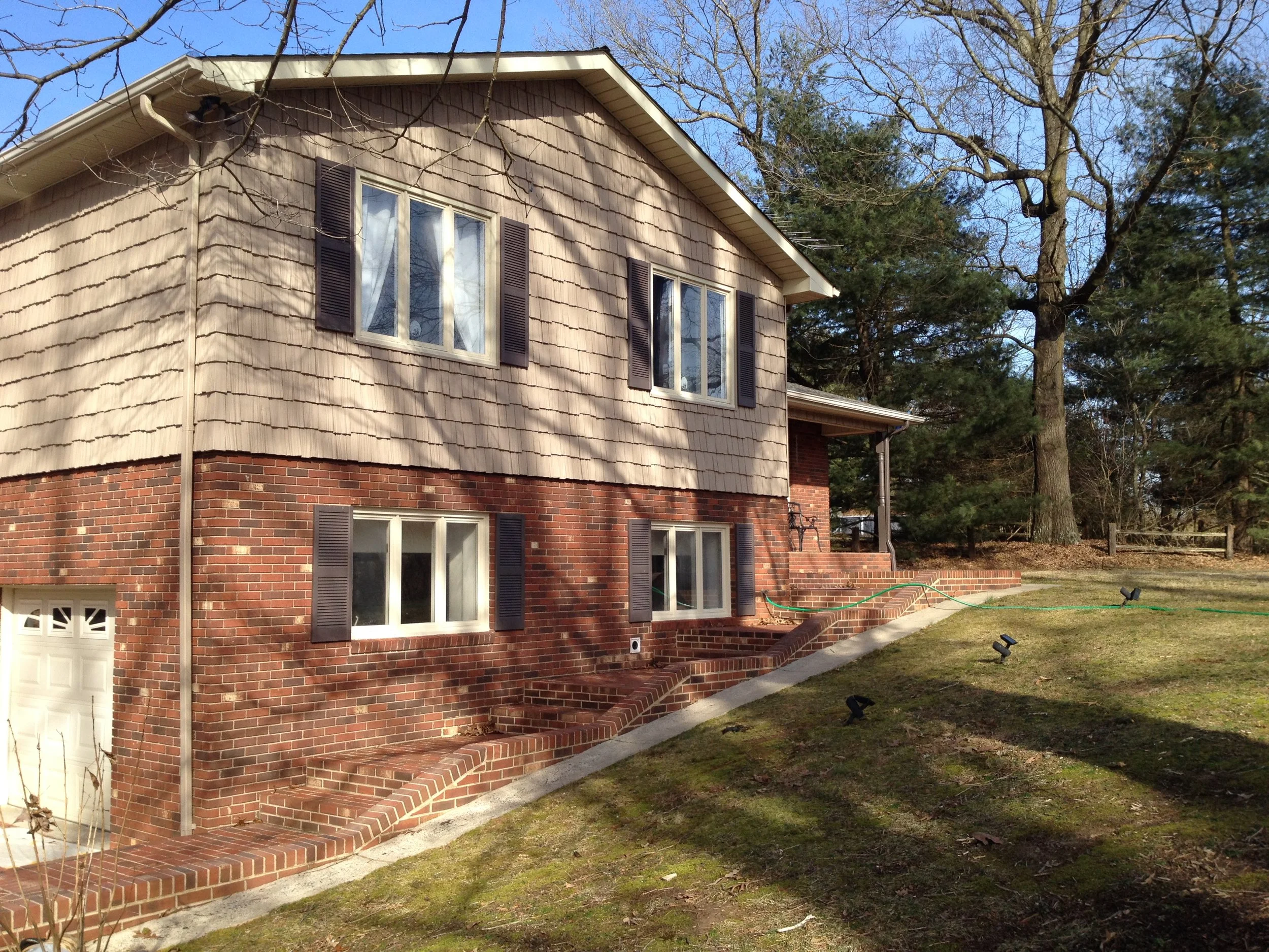 We didn't create any major transformations here, but this large and lovely home was renovated to repair and restore and update with new colors to refresh the home and add increased functionality and curb appeal. We restored and repaired the brick, updated with new colors and for all siding, trim, windows and doors, repaired and replaced windows and doors, repaired exterior trim and repainted the entire exterior, as well as did repairs to and restored the walkways, driveway and the rest of the property's exterior.