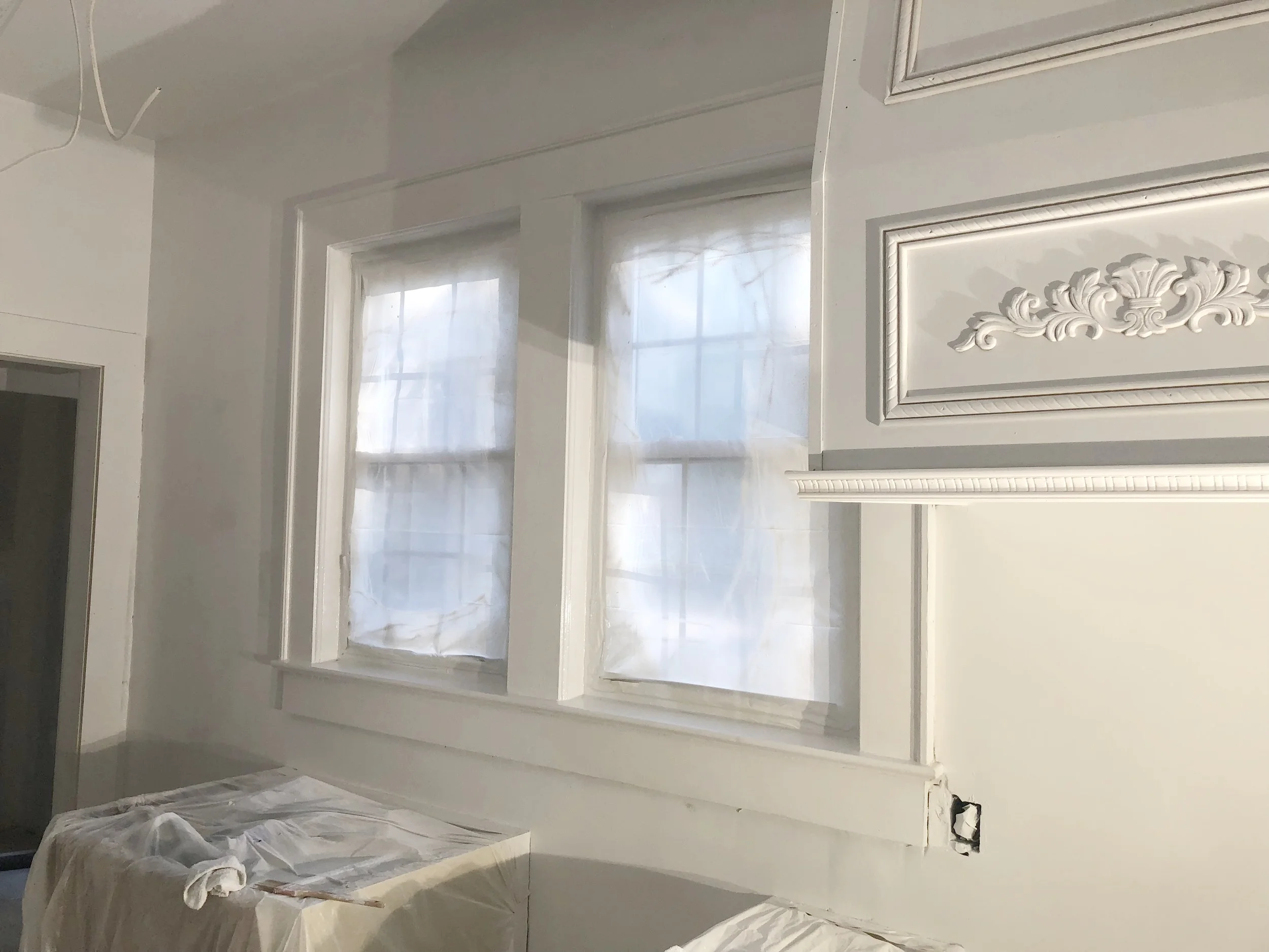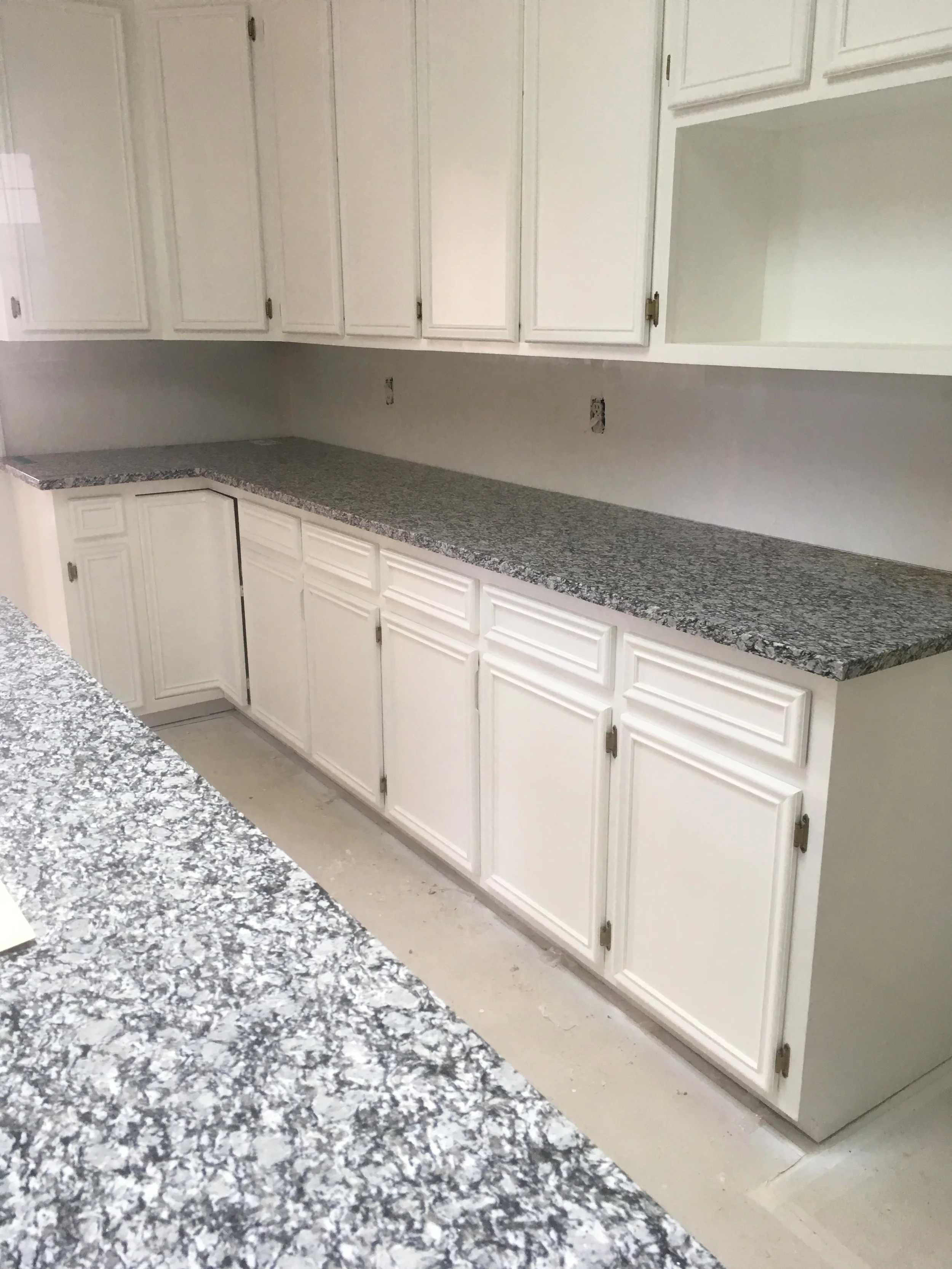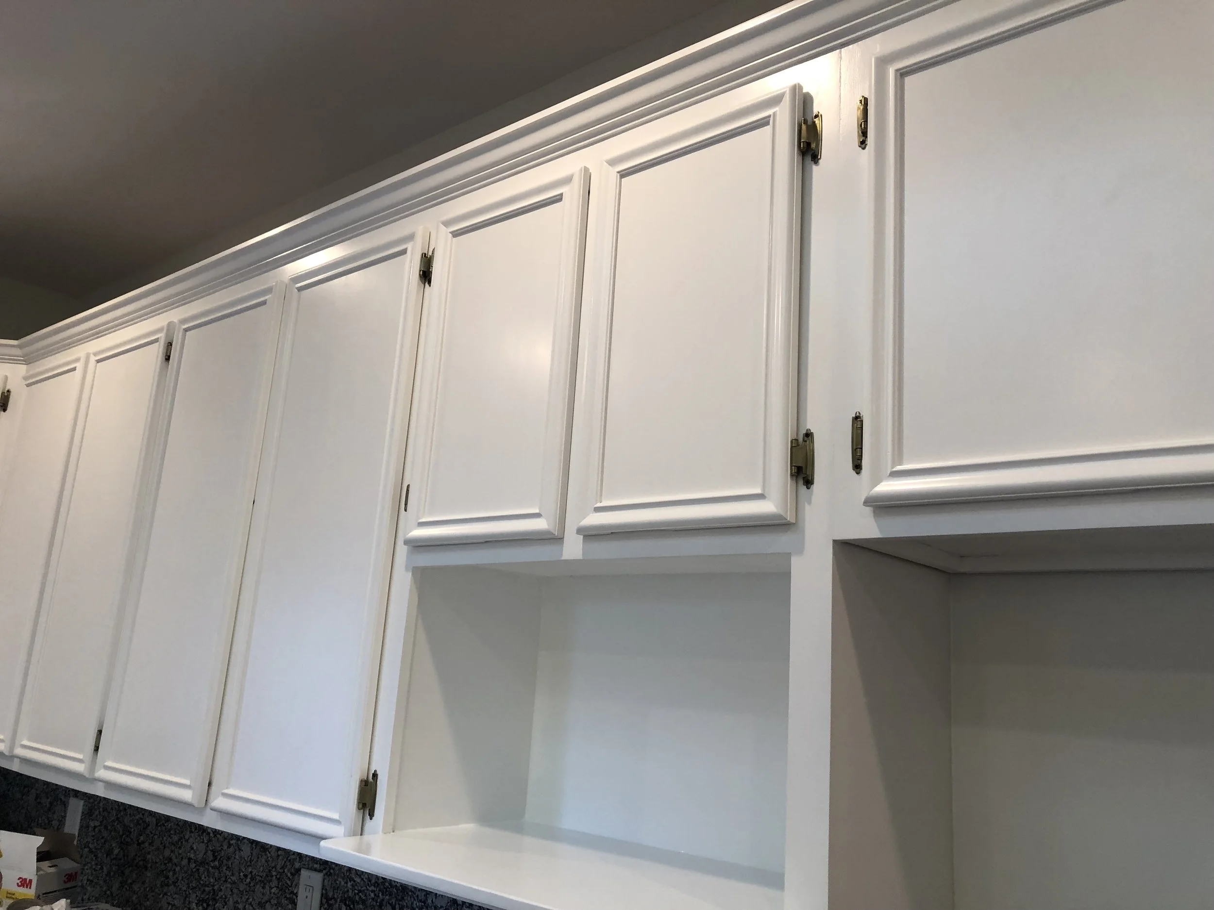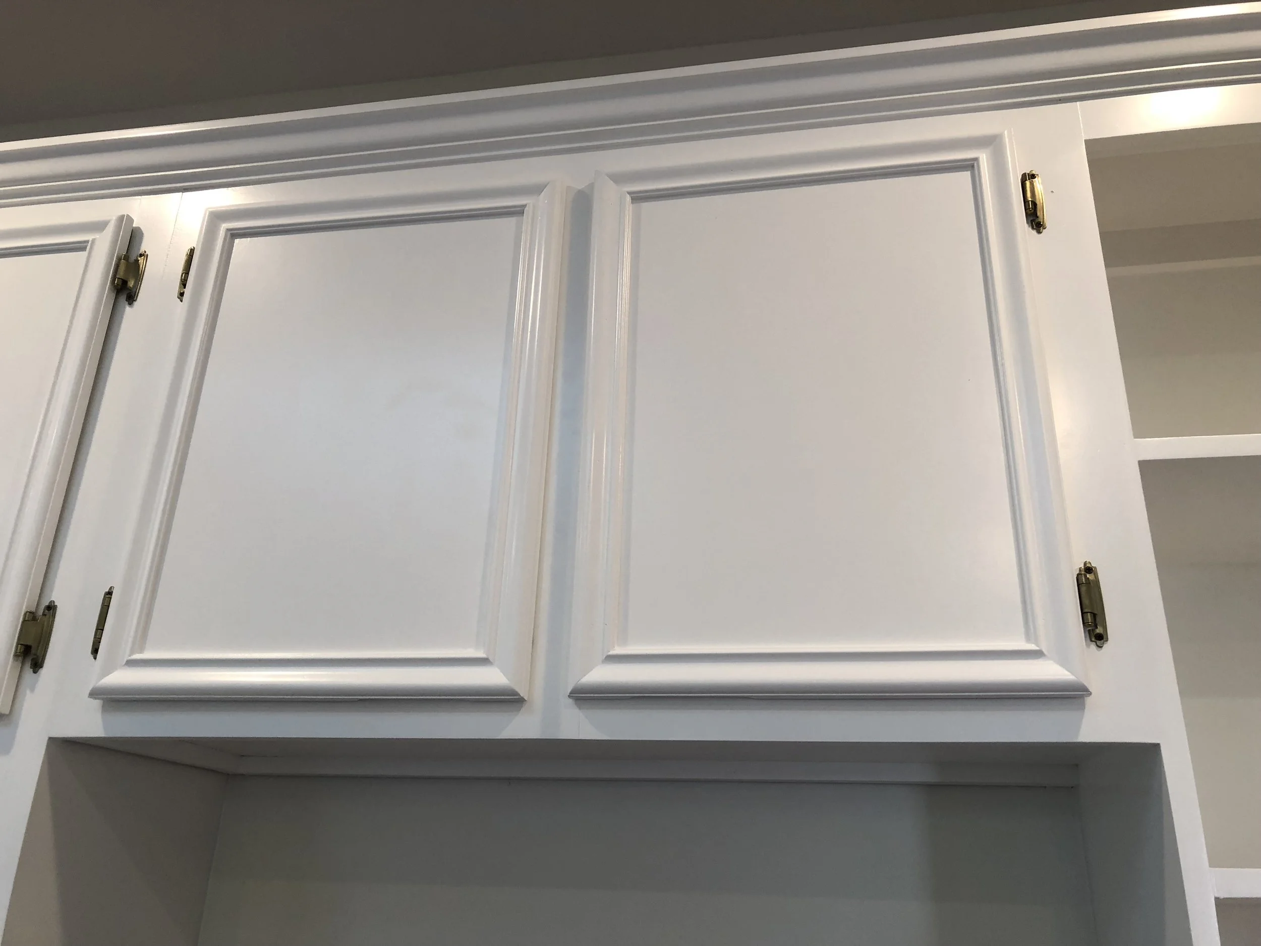The client initially thought she wanted a white and bold dark blue kitchen, then toyed with white and gray, then various hues of soft whites, then settled on the creamy all white colors we arrived at end in the end. The cabinets were painted Sherwin-Williams SW 7757 High Reflective White and her custom-built hutch was repainted in the same hue and had doors added. The walls are Sherwin-Williams SW 7566 Westhighland White and the trim is also High Reflective White, Westhighland White is a very creamy white that balances the true bright white of the cabinets and trim.