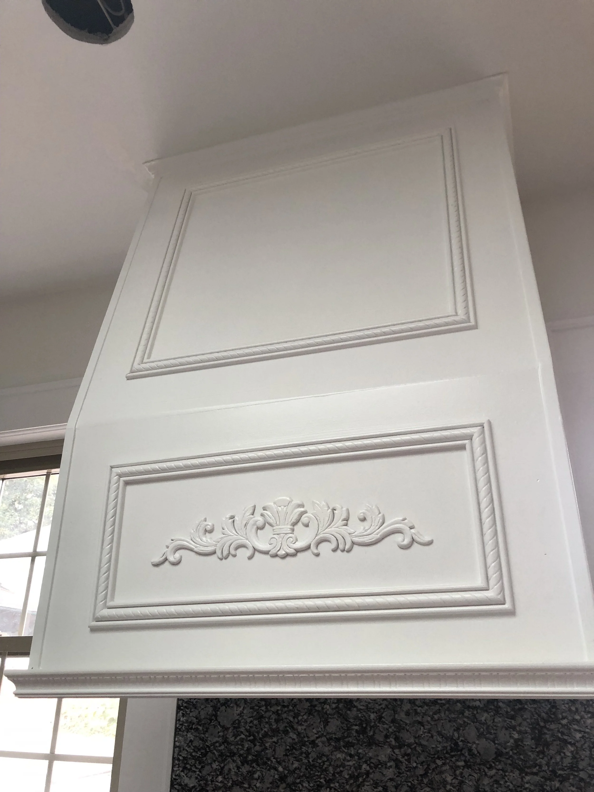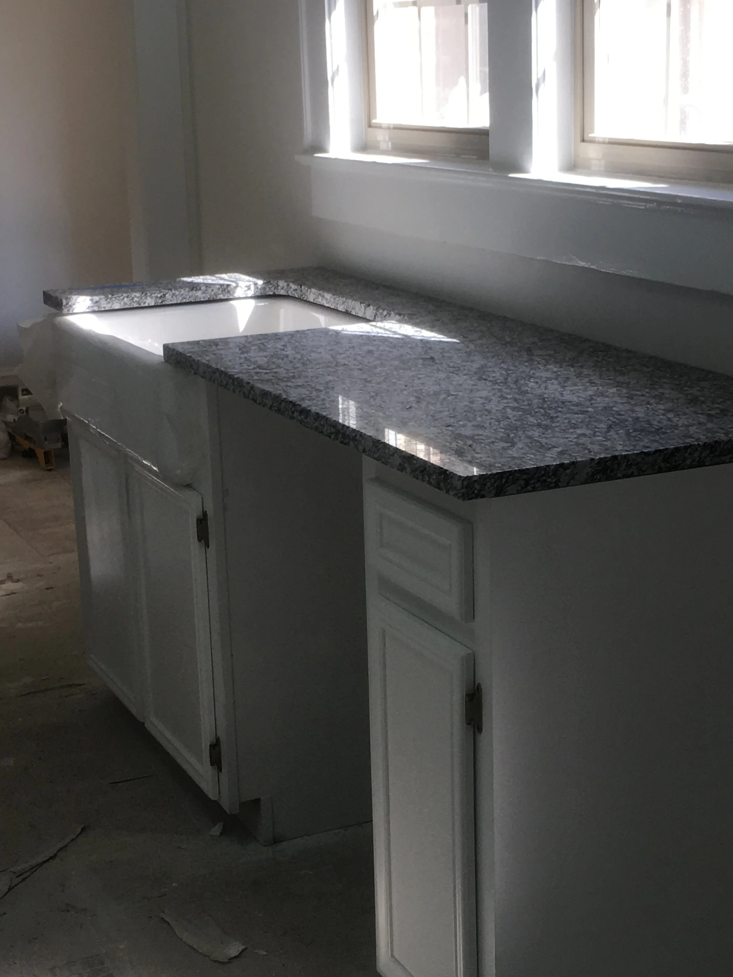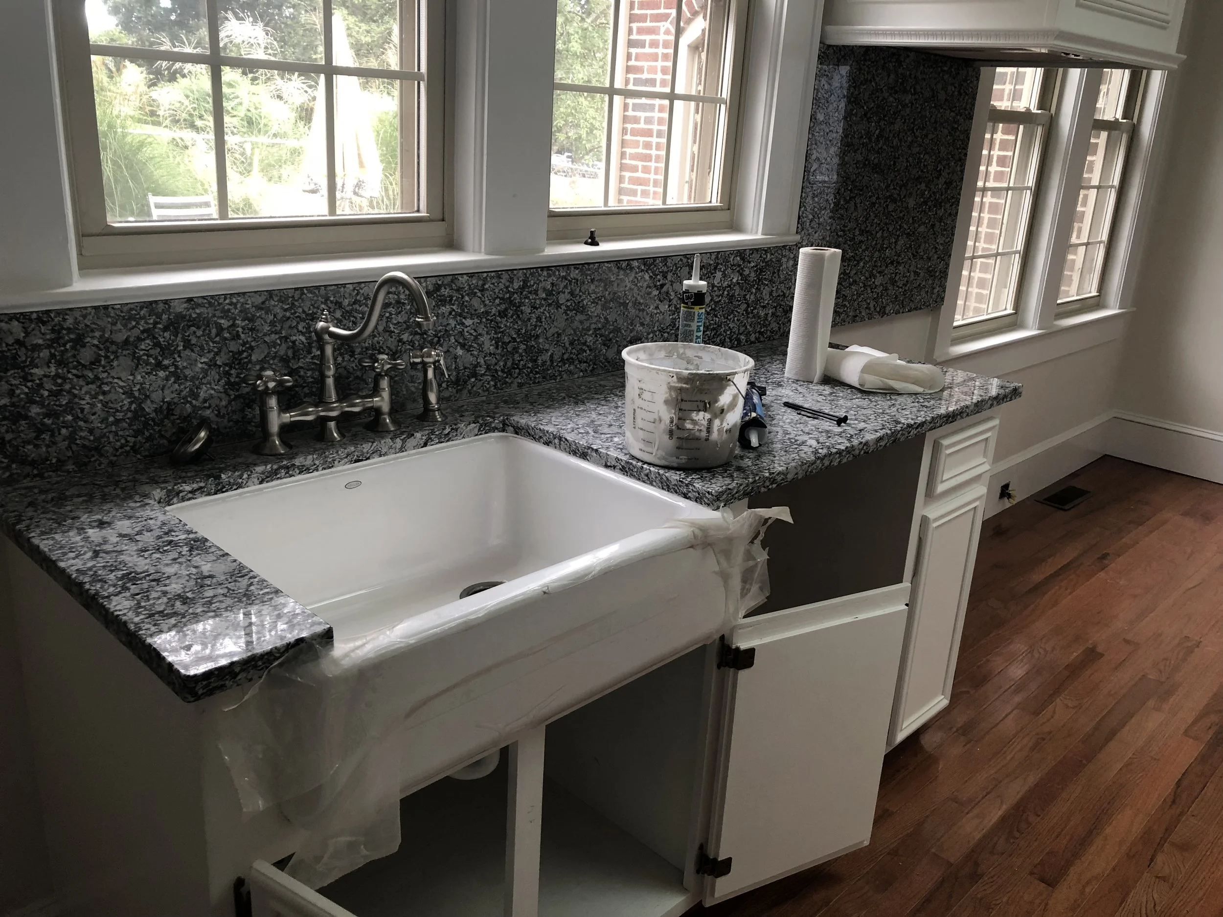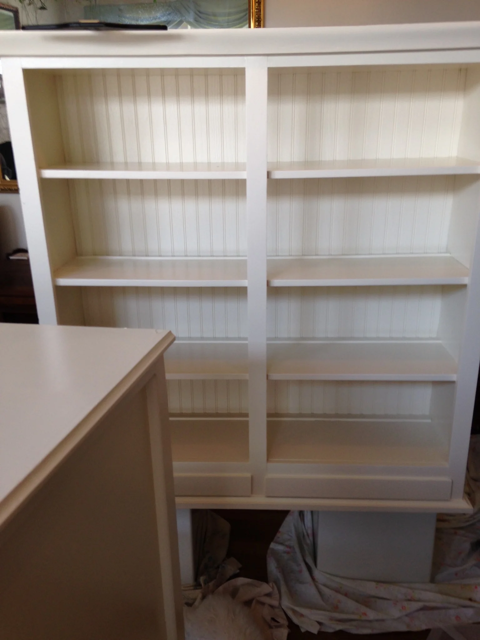 The client initially thought she wanted a white and bold dark blue kitchen, then toyed with white and gray, then various hues of soft whites, then settled on the creamy all white colors we arrived at end in the end. The cabinets were painted Sherwin-Williams SW 7757 High Reflective White and her custom-built hutch was repainted in the same hue and had doors added. The walls are Sherwin-Williams SW 7566 Westhighland White and the trim is also High Reflective White, Westhighland White is a very creamy white that balances the true bright white of the cabinets and trim.