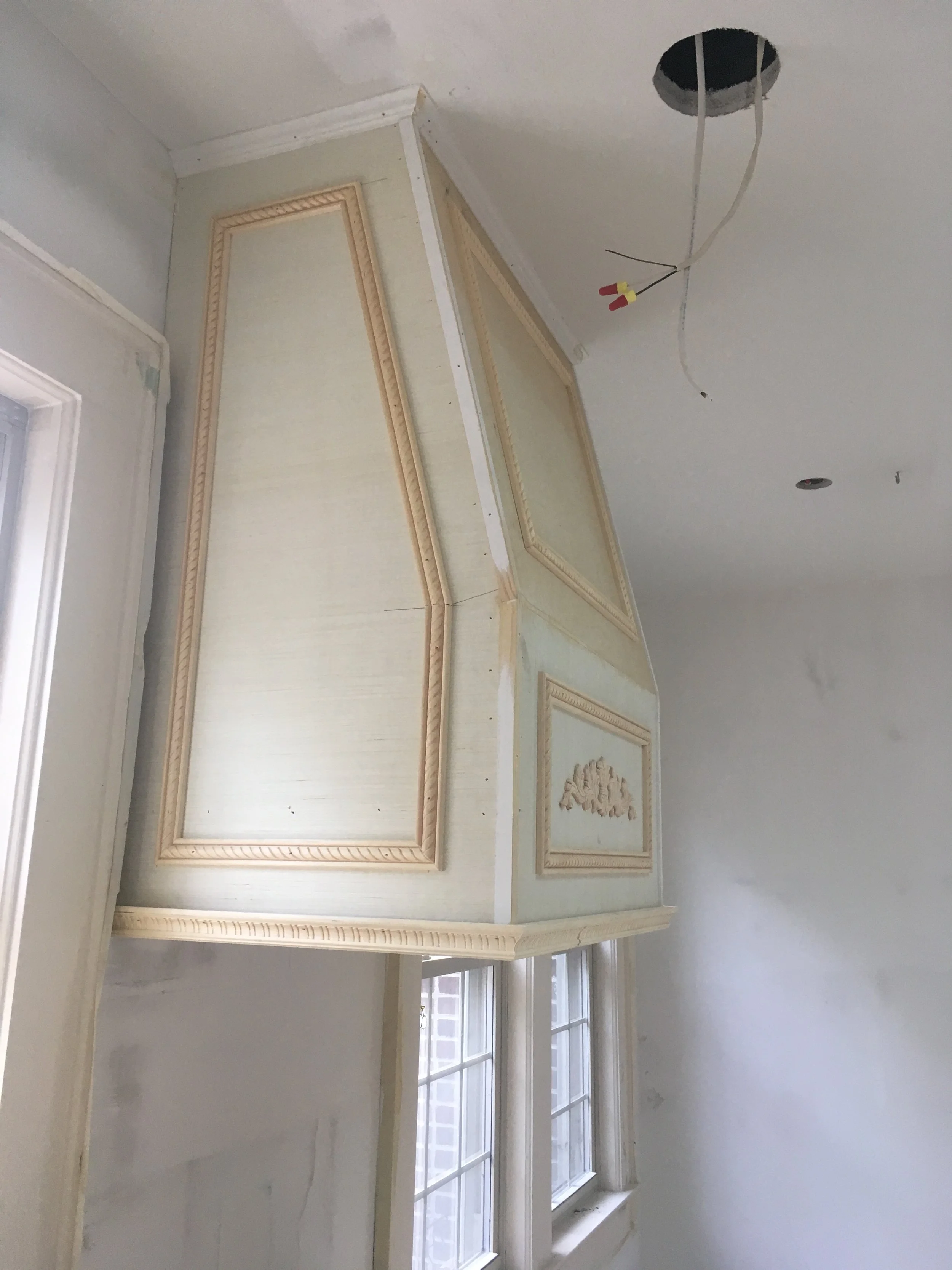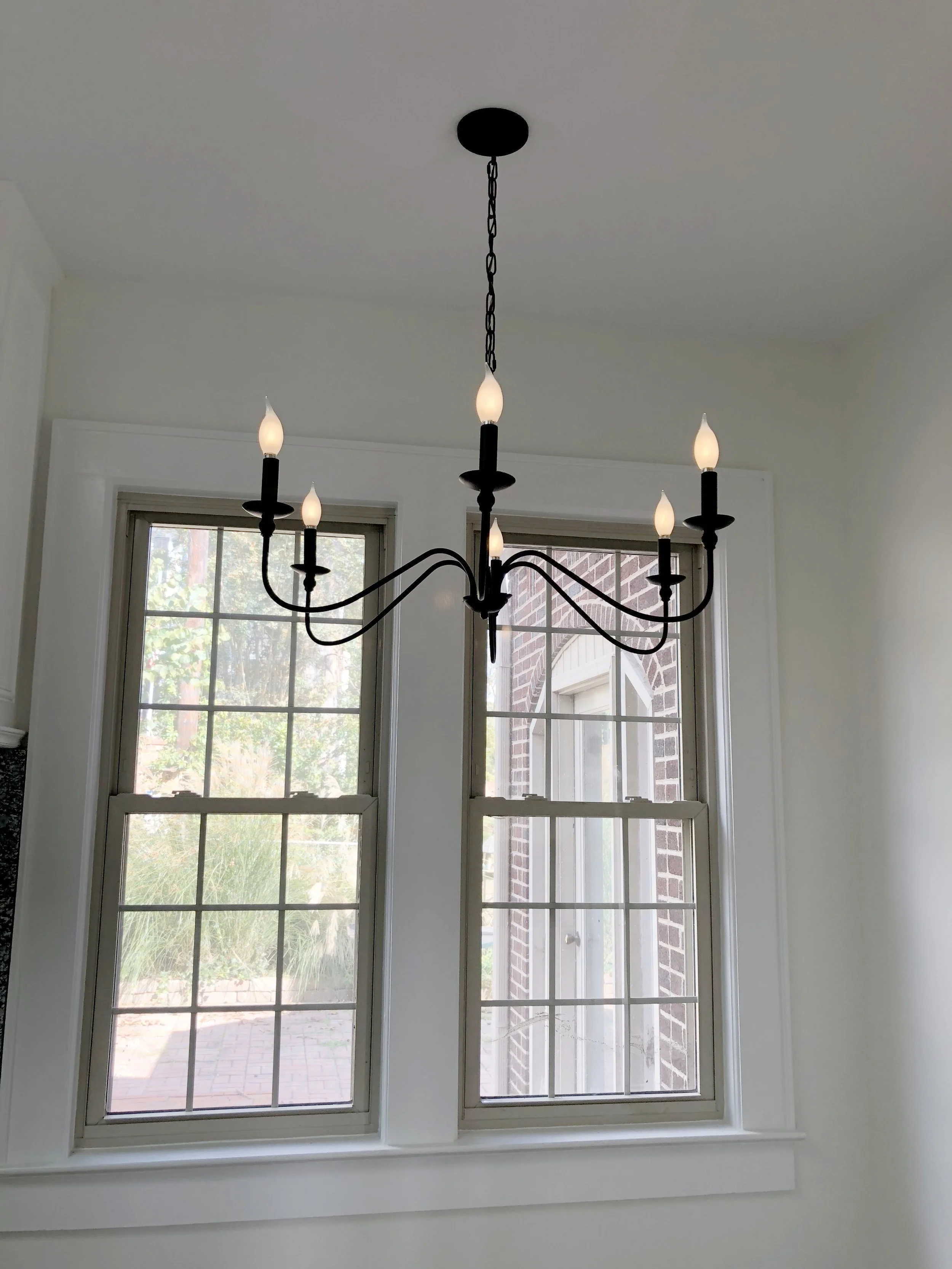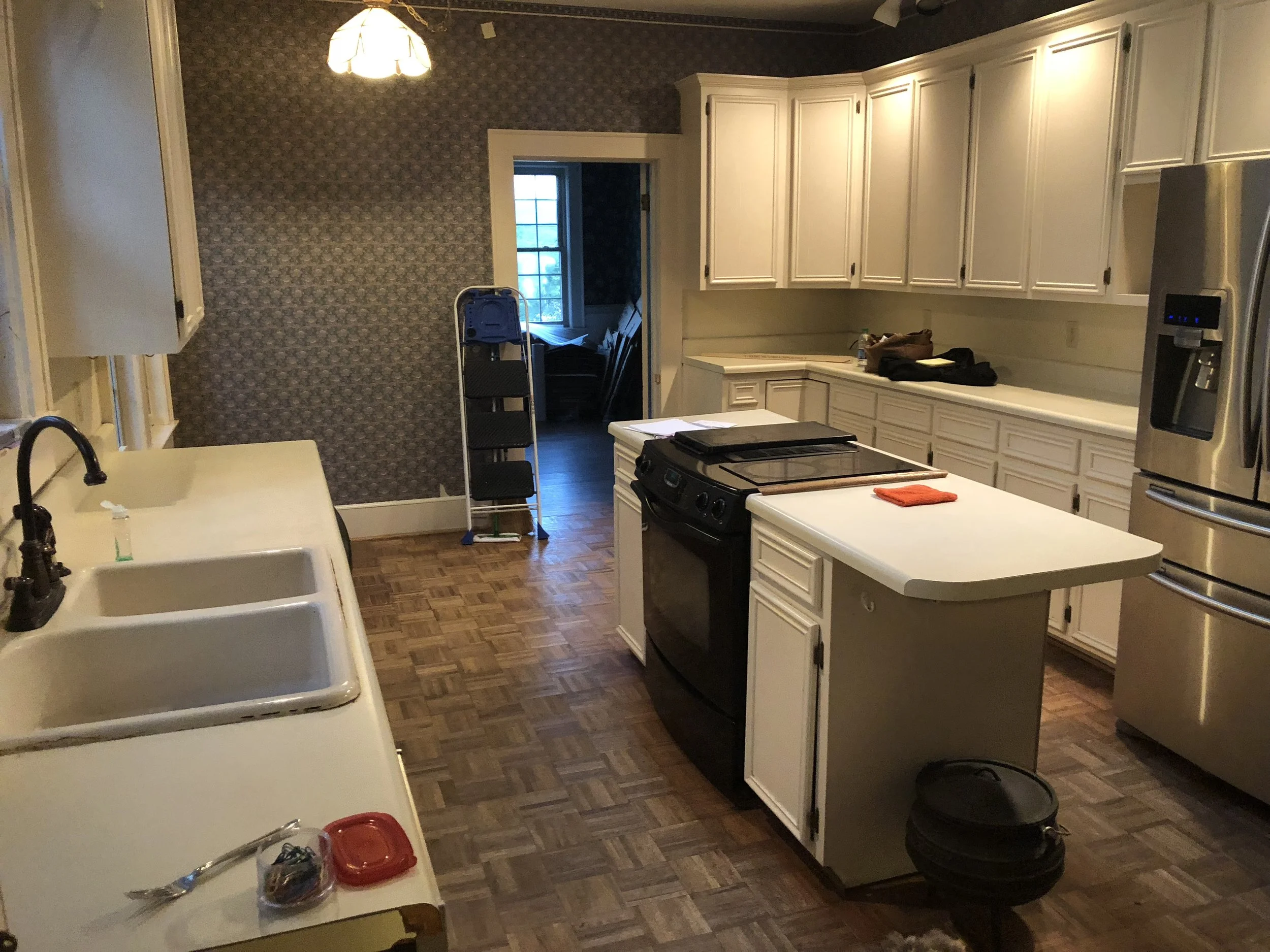 All the dark wallpaper was removed, the cabinets were repainted, the old parquet wood flooring was replaced, new appliances were added, the stove was moved from the island to its new location beside the sink so that the island could be used for food prep, and an amazing new custom built vent hood was added, The new granite countertops and granite backsplash are from Cub Creek Kitchens and Baths, and a new farmhouse sink and new lighting were introduced, including recessed lighting and a new chandelier. The black wrought iron chandelier is the Hamza 6 Light Chandelier from Wayfair.