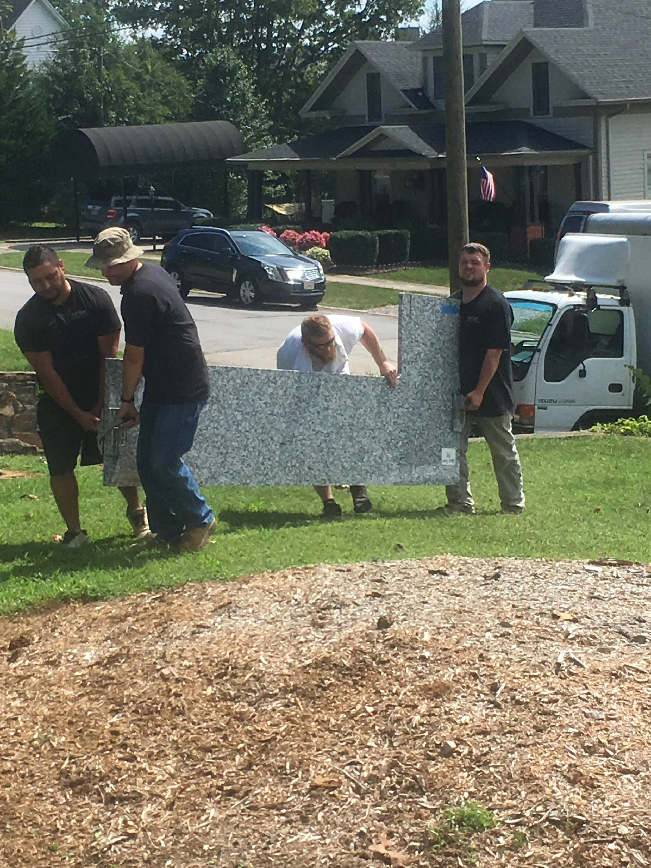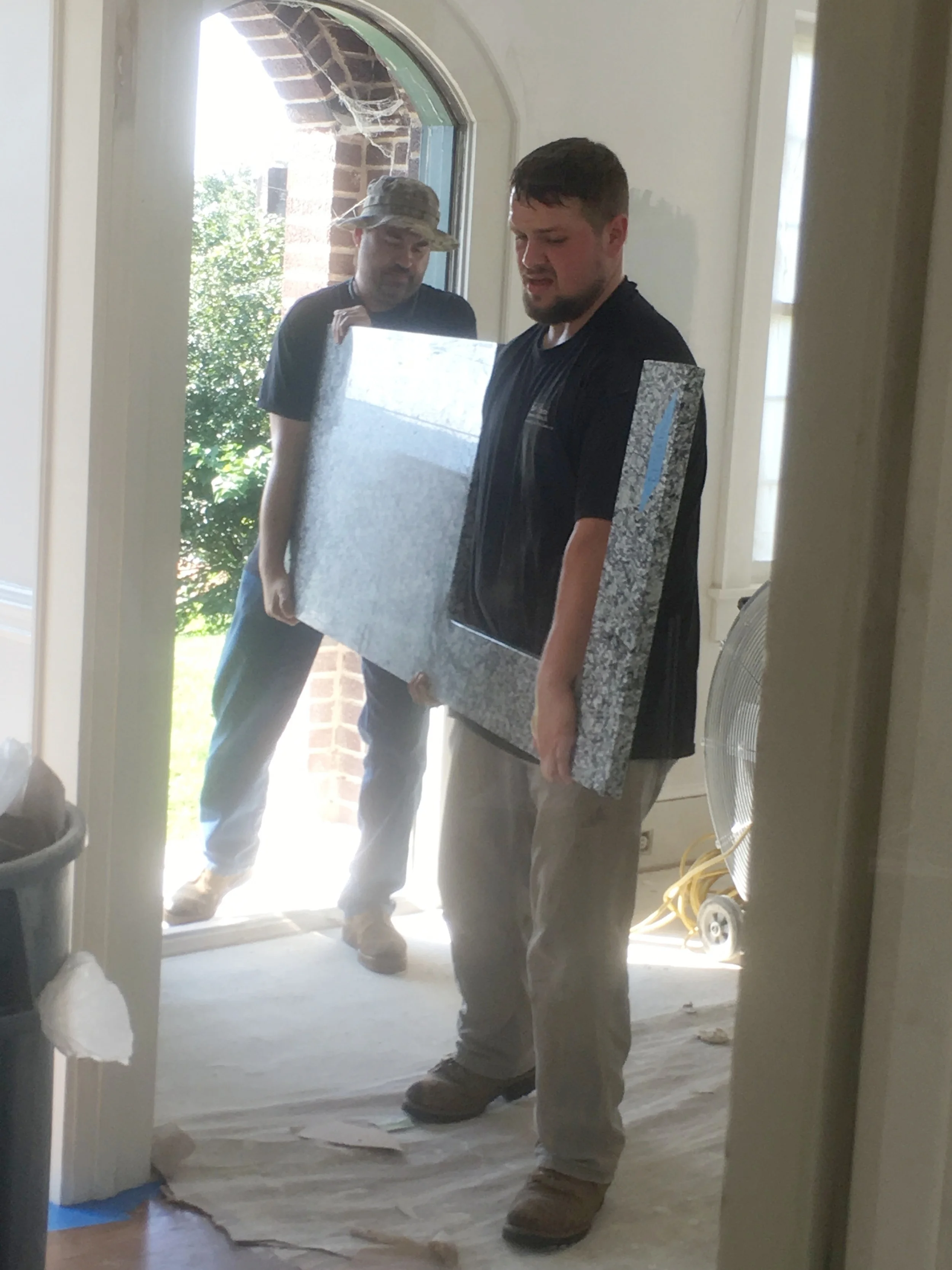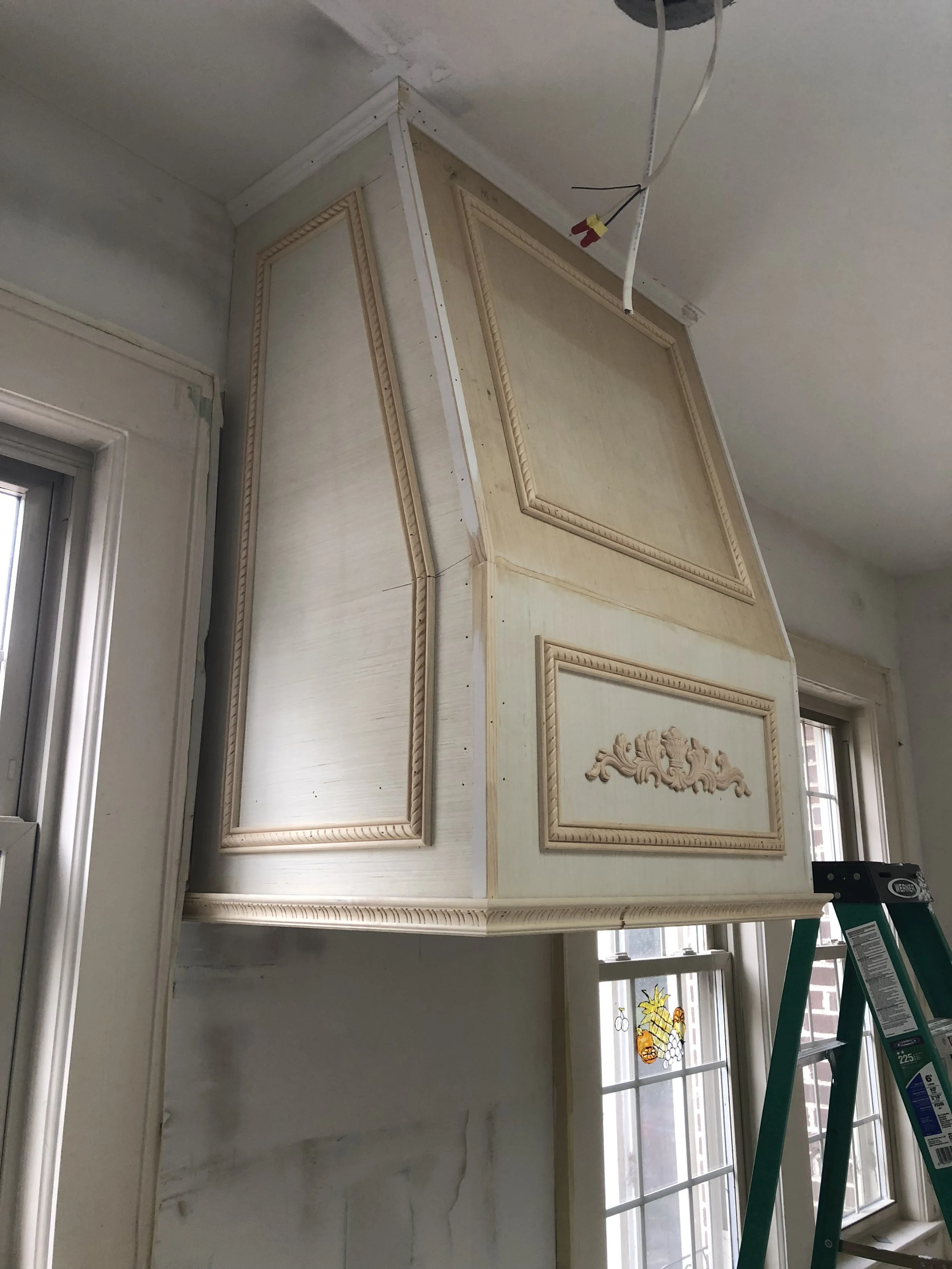 All the dark wallpaper was removed, the cabinets were repainted, the old parquet wood flooring was replaced, new appliances were added, the stove was moved from the island to its new location beside the sink so that the island could be used for food prep, and an amazing new custom built vent hood was added, The new granite countertops and granite backsplash are from Cub Creek Kitchens and Baths, and a new farmhouse sink and new lighting were introduced, including recessed lighting and a new chandelier. The black wrought iron chandelier is the Hamza 6 Light Chandelier from Wayfair.