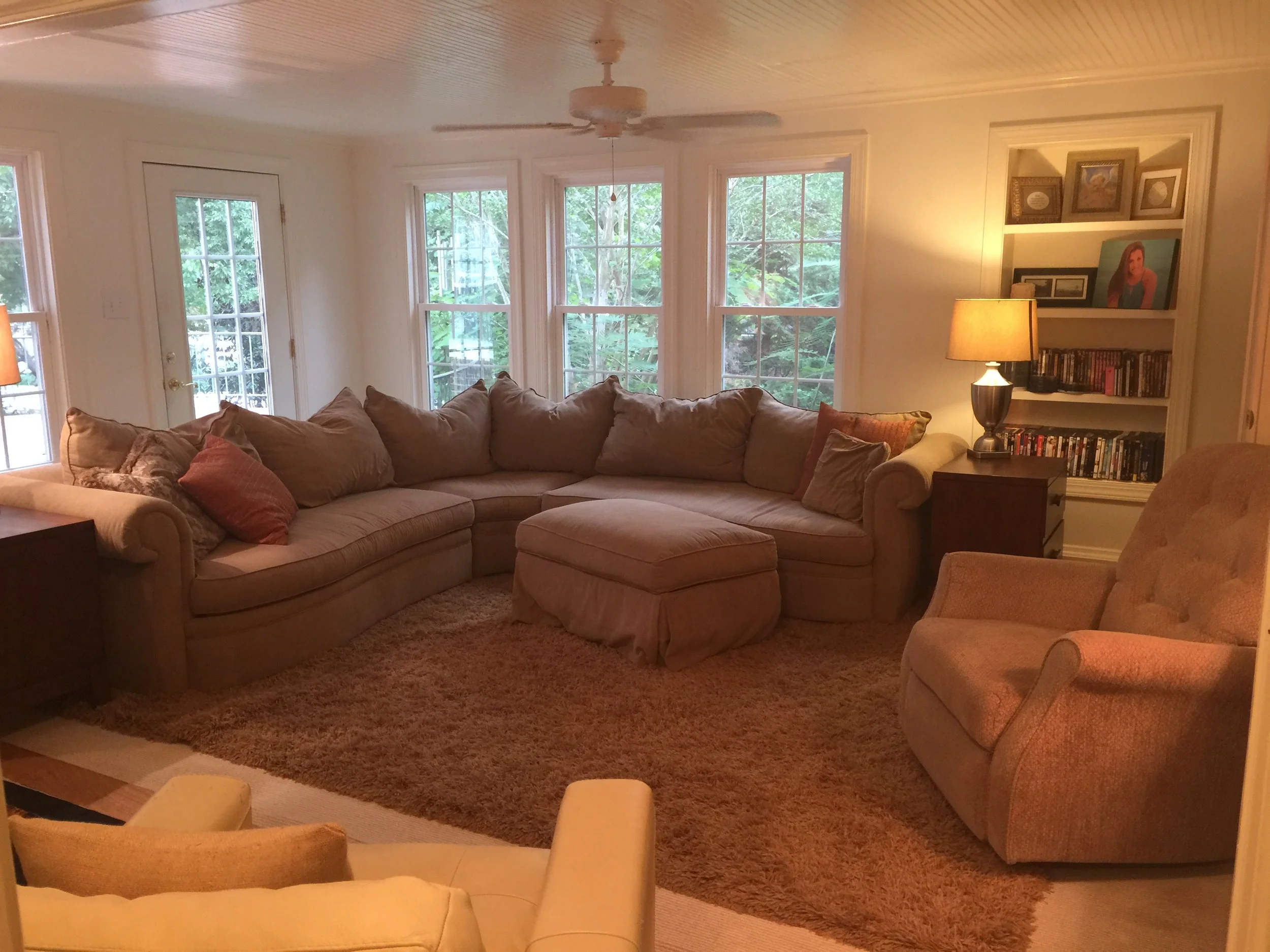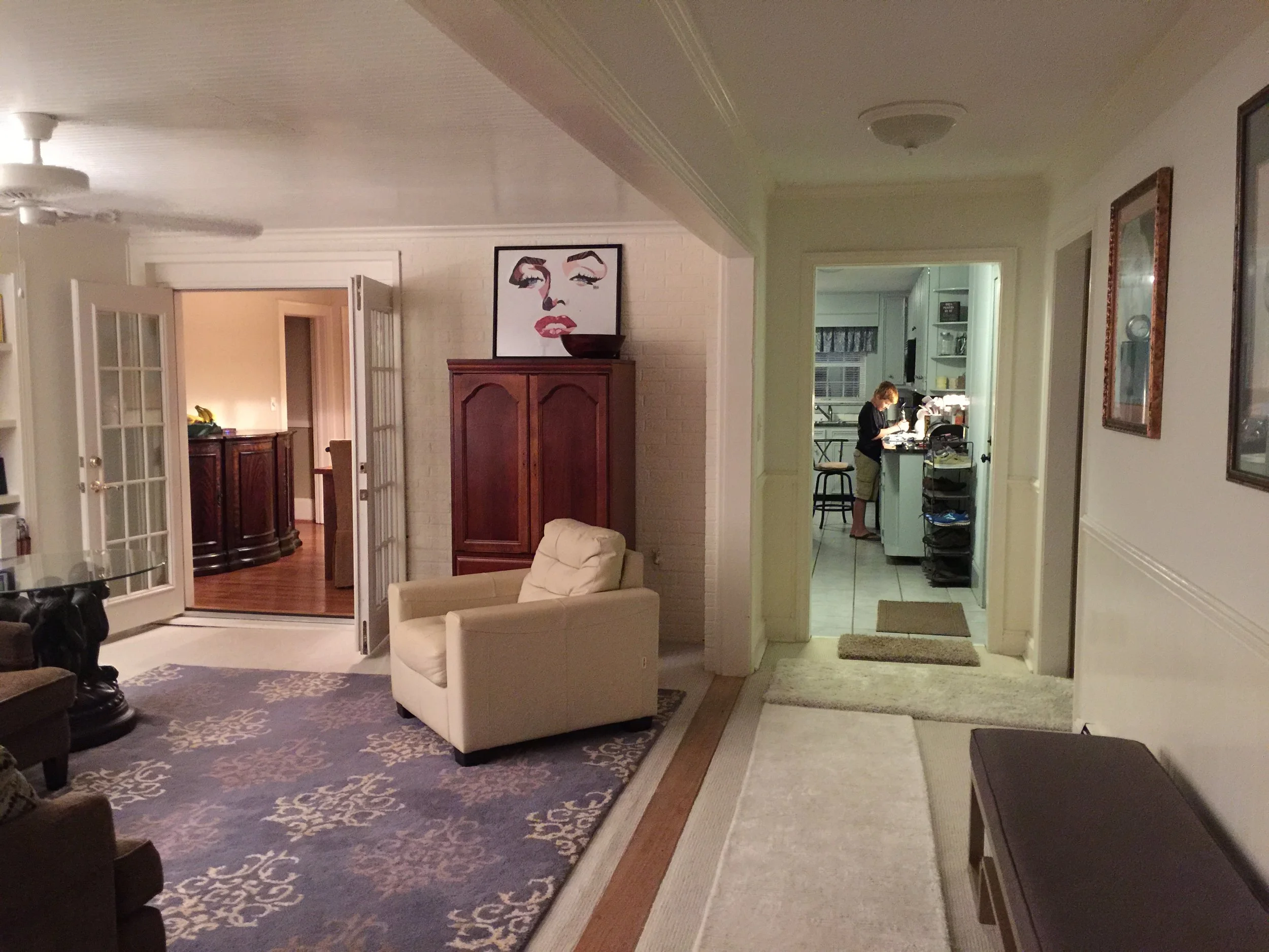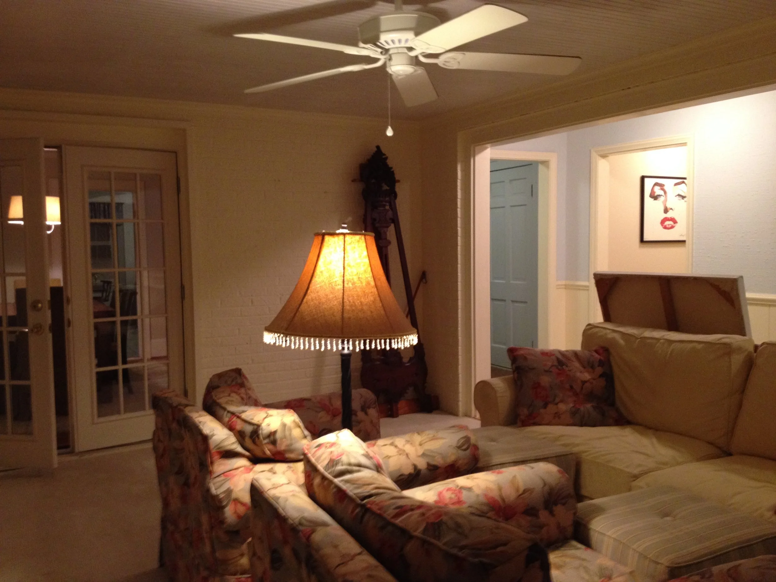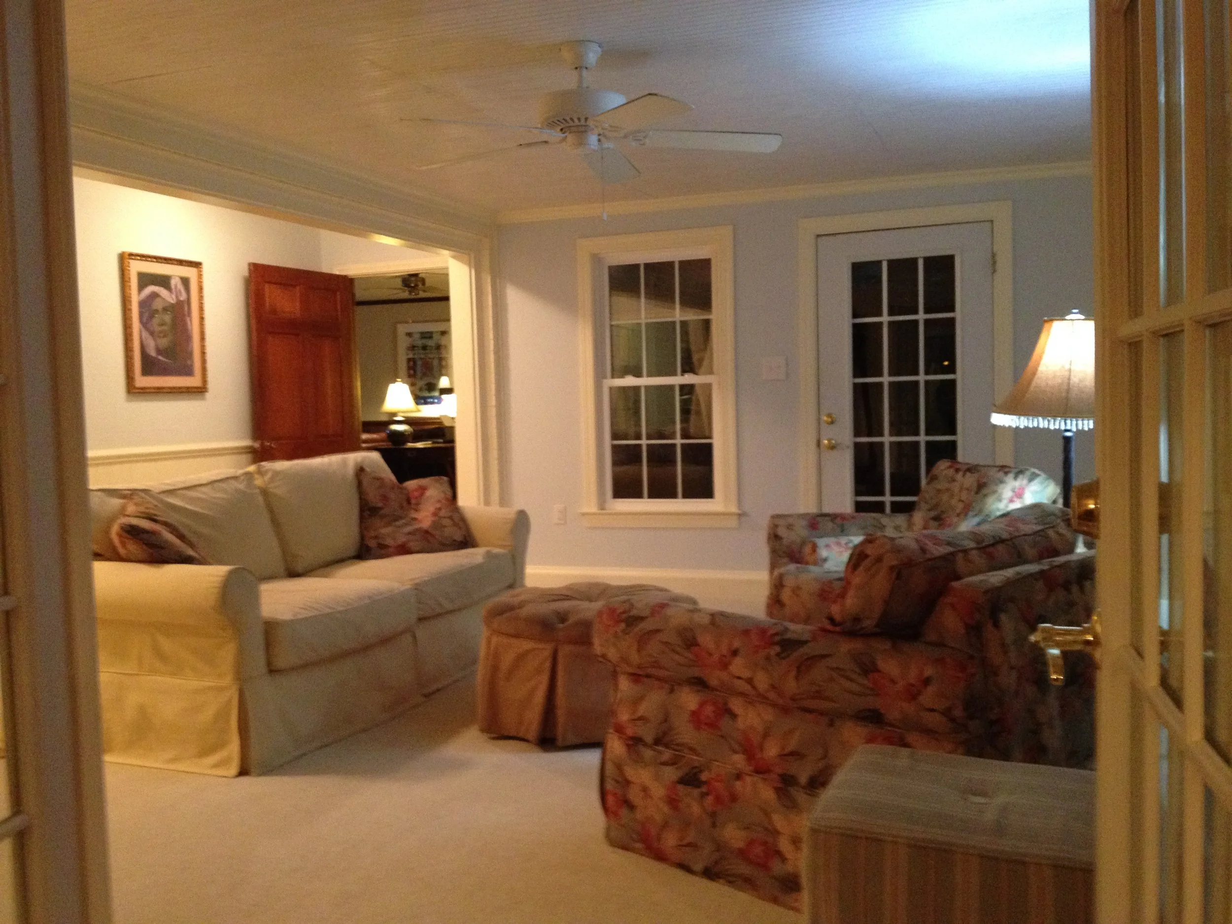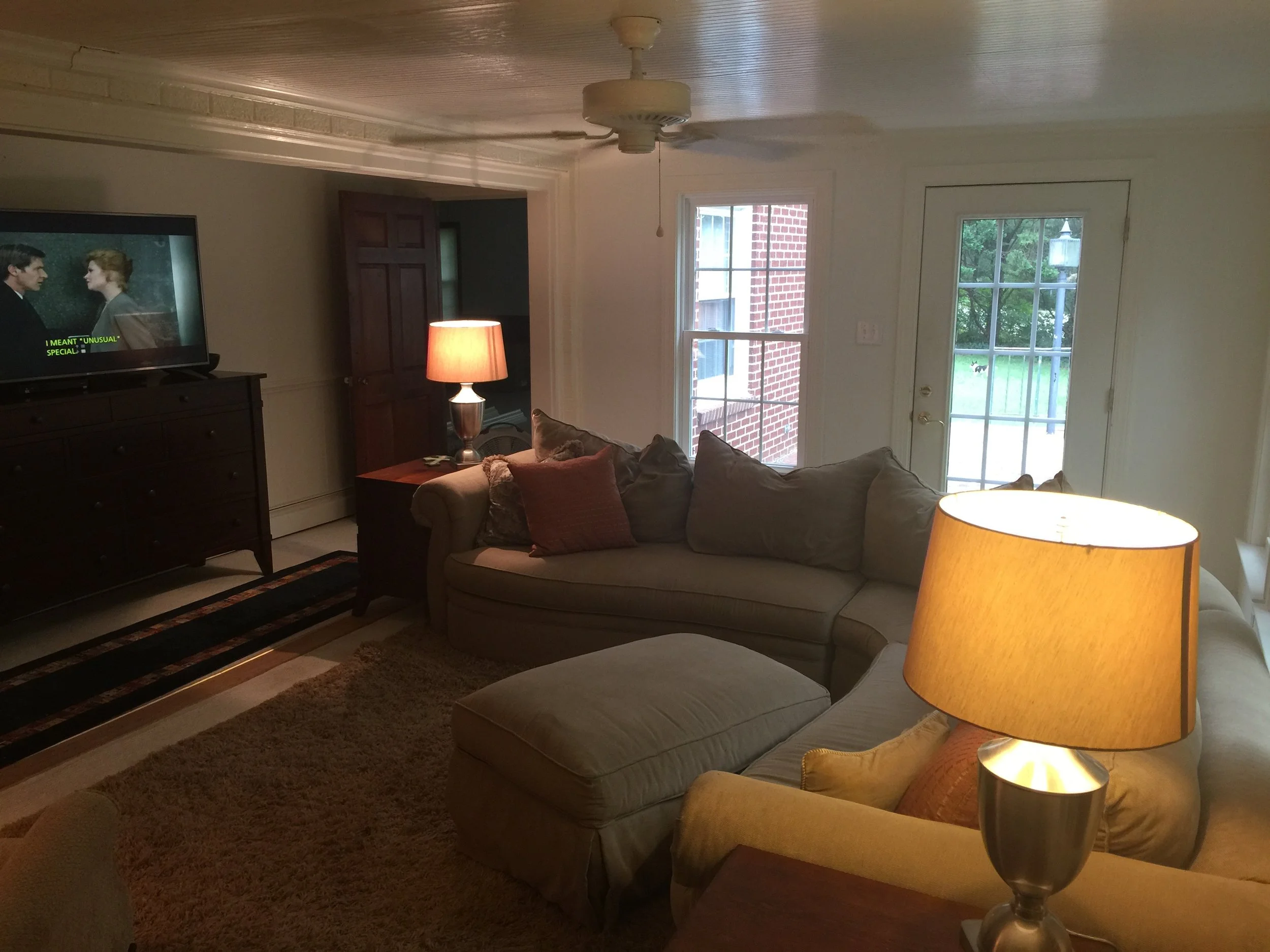 The sunroom is a work in progress, for many reasons. I want it to be light and bright and colorful, which it is definitely not right now. But it has access to the backyard with lots of windows and light and a great view of the circular brick patio and the backyard. It is located off the dining room and kitchen to the right and the den to the left, and is also the adjacent to the master bedroom and a powder room. We gather there comfortably as a family and watch television in there. So it functions as my den, as I have big plans for the large den in this home to become something else entirely, as I do not think the house needs three large living areas and will function very nicely with two, plus the basement.