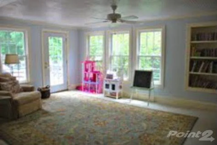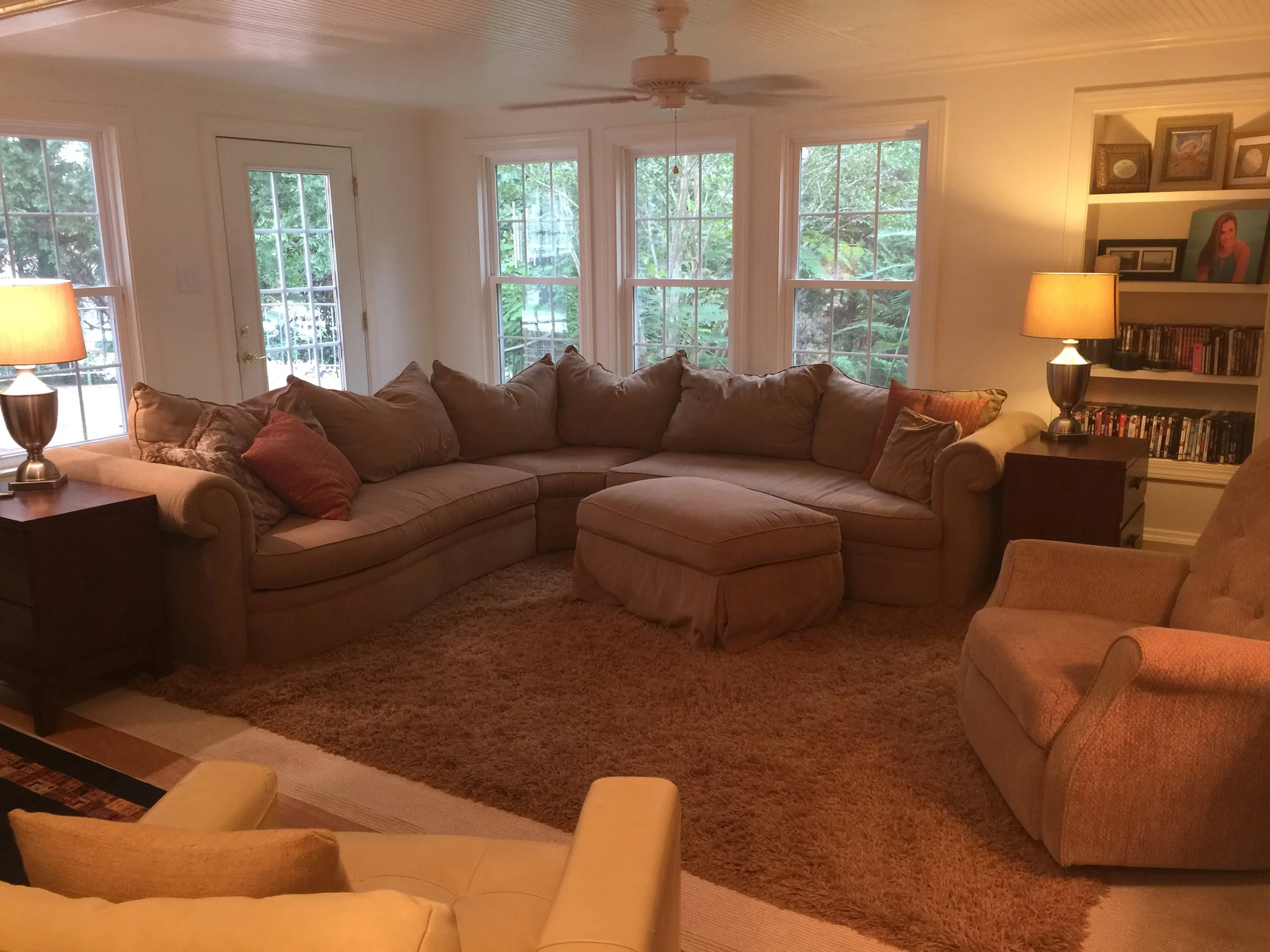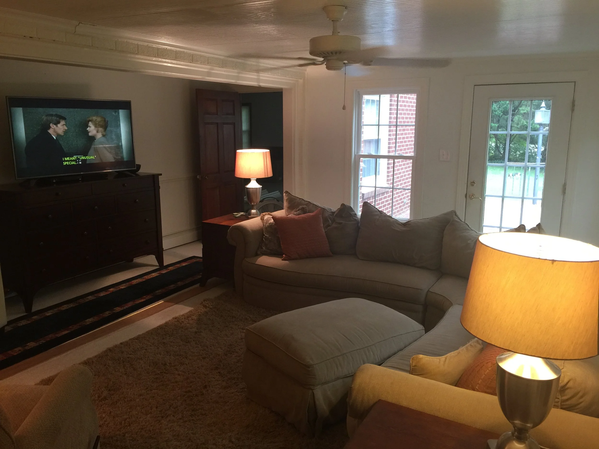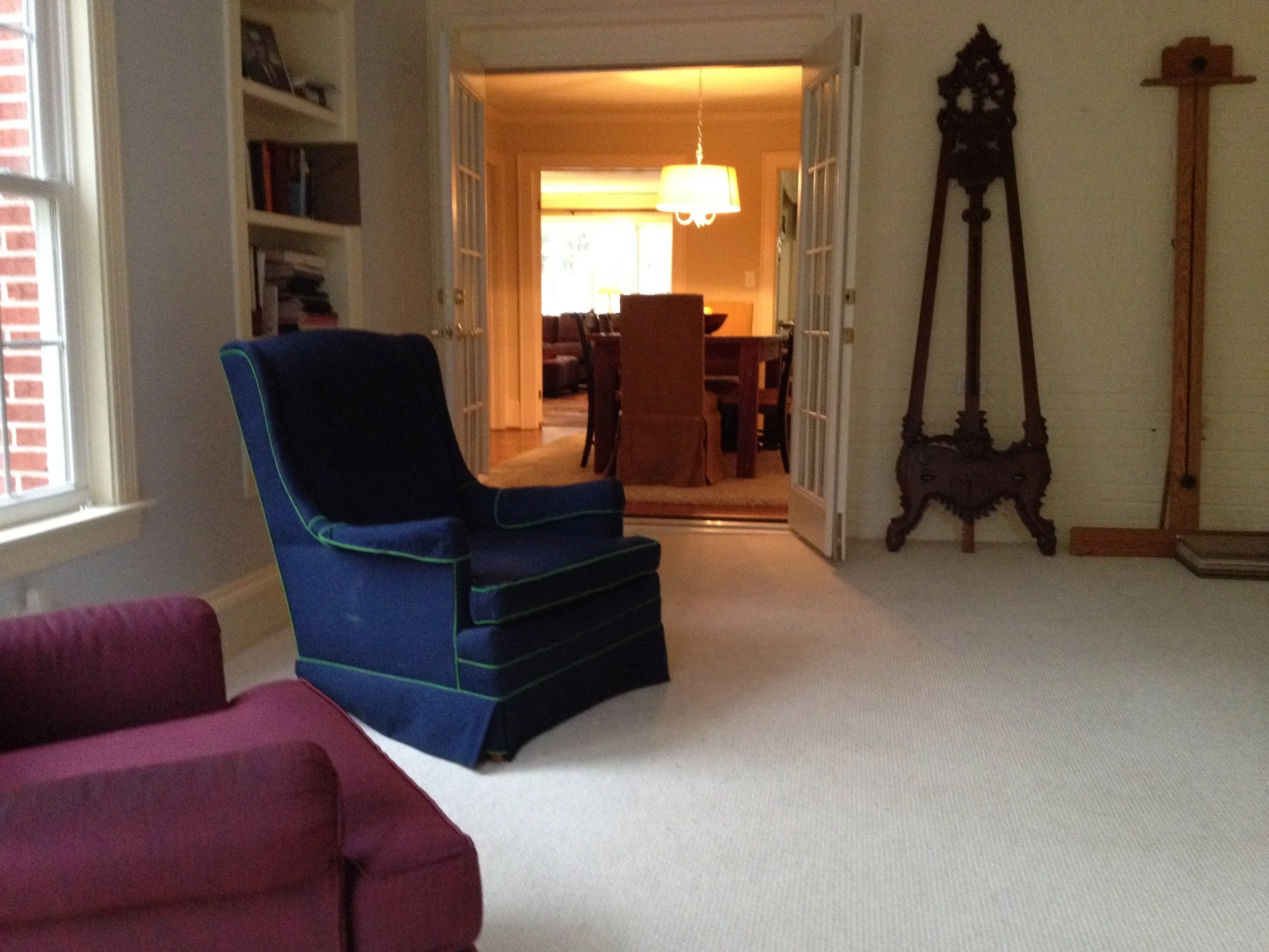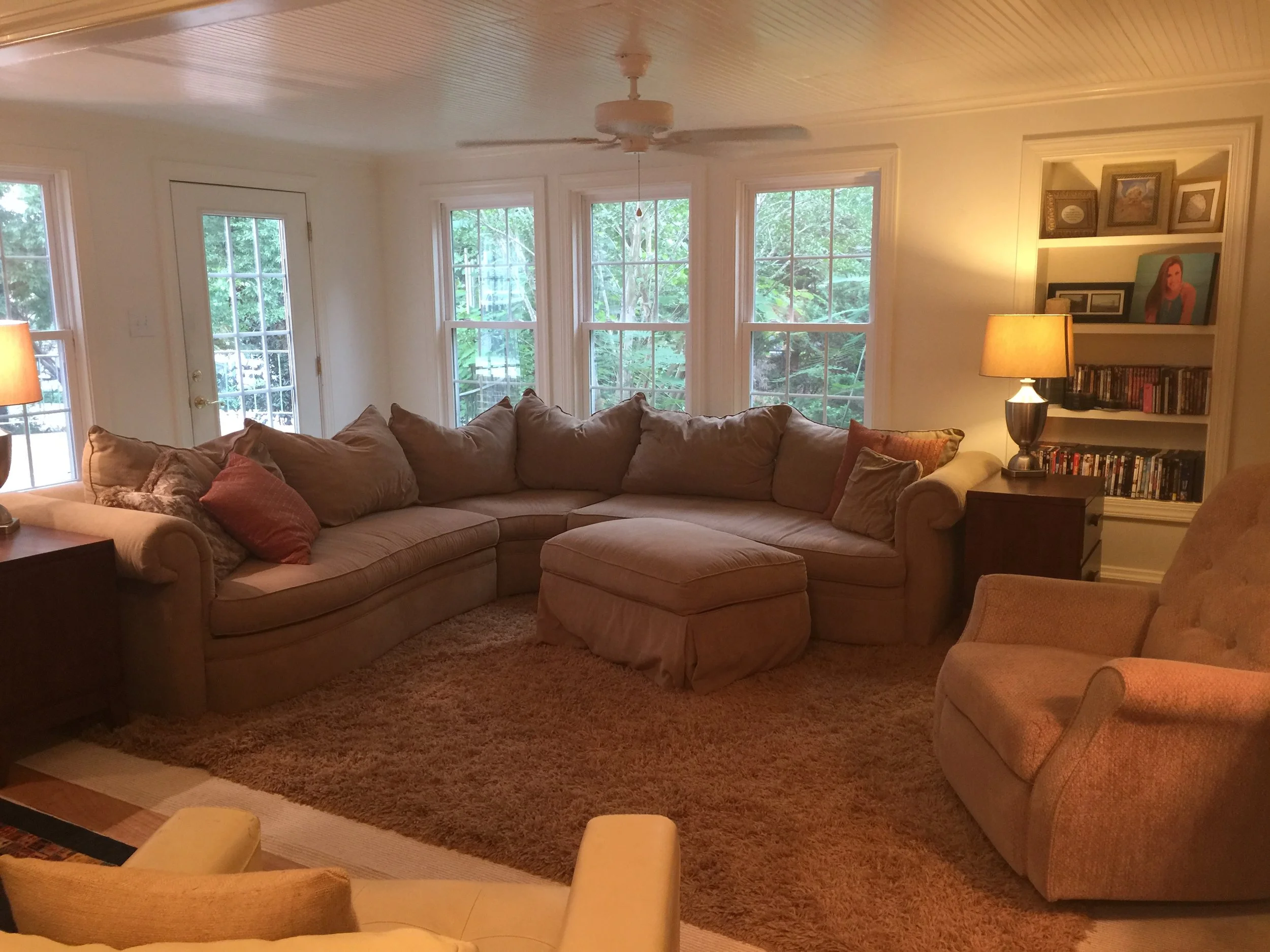 The sunroom is a work in progress, for many reasons. I want it to be light and bright and colorful, which it is definitely not right now. But it has access to the backyard with lots of windows and light and a great view of the circular brick patio and the backyard. It is located off the dining room and kitchen to the right and the den to the left, and is also the adjacent to the master bedroom and a powder room. We gather there comfortably as a family and watch television in there. So it functions as my den, as I have big plans for the large den in this home to become something else entirely, as I do not think the house needs three large living areas and will function very nicely with two, plus the basement.