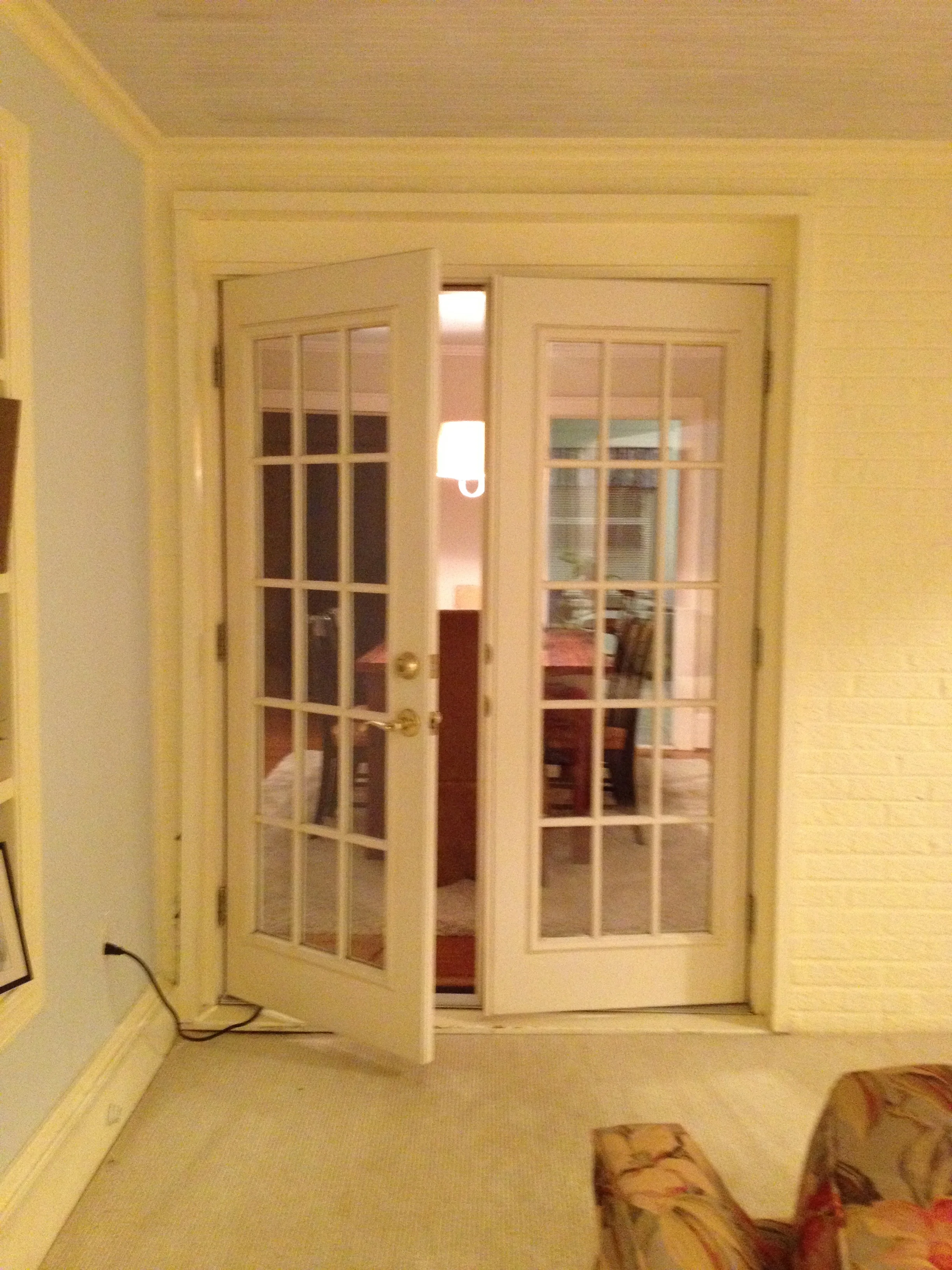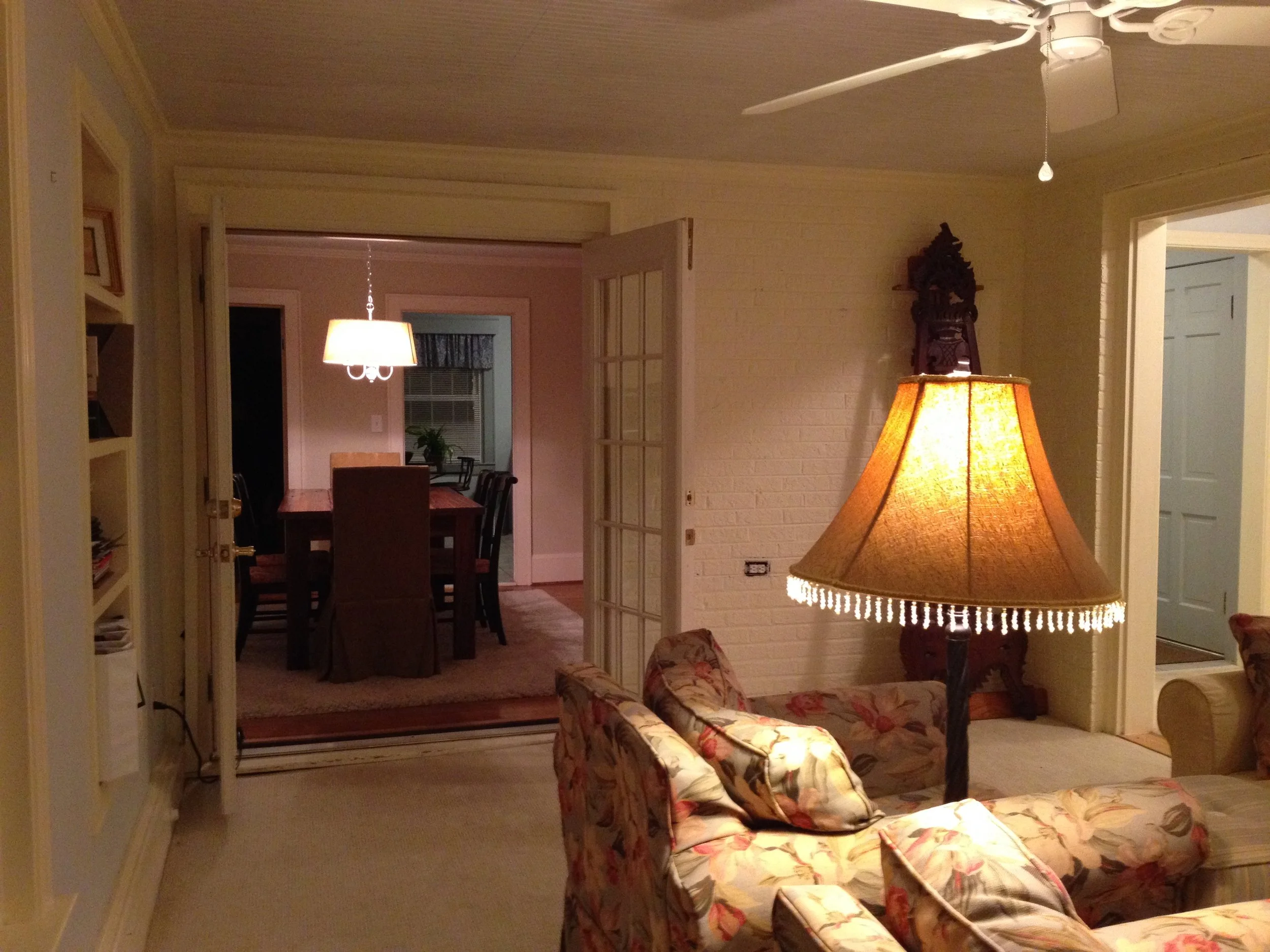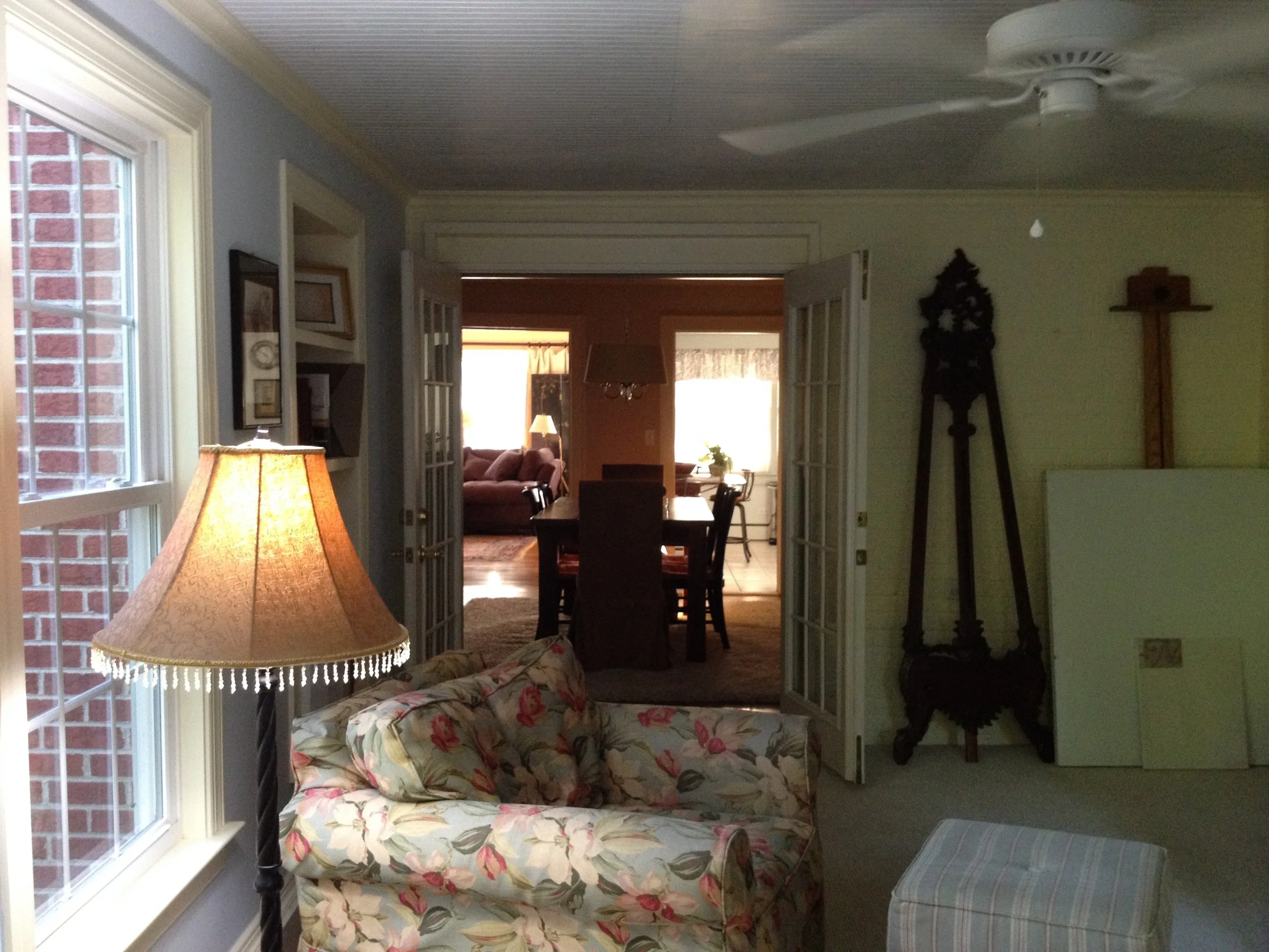 There have been some problems with this room since we moved in, to do with the flat roof above it. It was converted at some point into the sunroom, but used to be the back porch originally (they cut out most of the exterior brick on one wall and the original exterior brick that is left near the kitchen has been painted over). When it was a back porch, there was an interior hallway that led to the den. The french doors leading from the dining room to the sunroom looked much homier once we removed the weather stripping. There is also still a functioning outdoor water faucet in the room that I have capped off for now, but plan to eliminate entirely when the kitchen is renovated in the future. The flat roof is the only part of the roof that is flat and it has a leak issue that must be resolved, with all the ramifications that entails for moisture, if I can get a roofer out here. They apparently are quite busy.