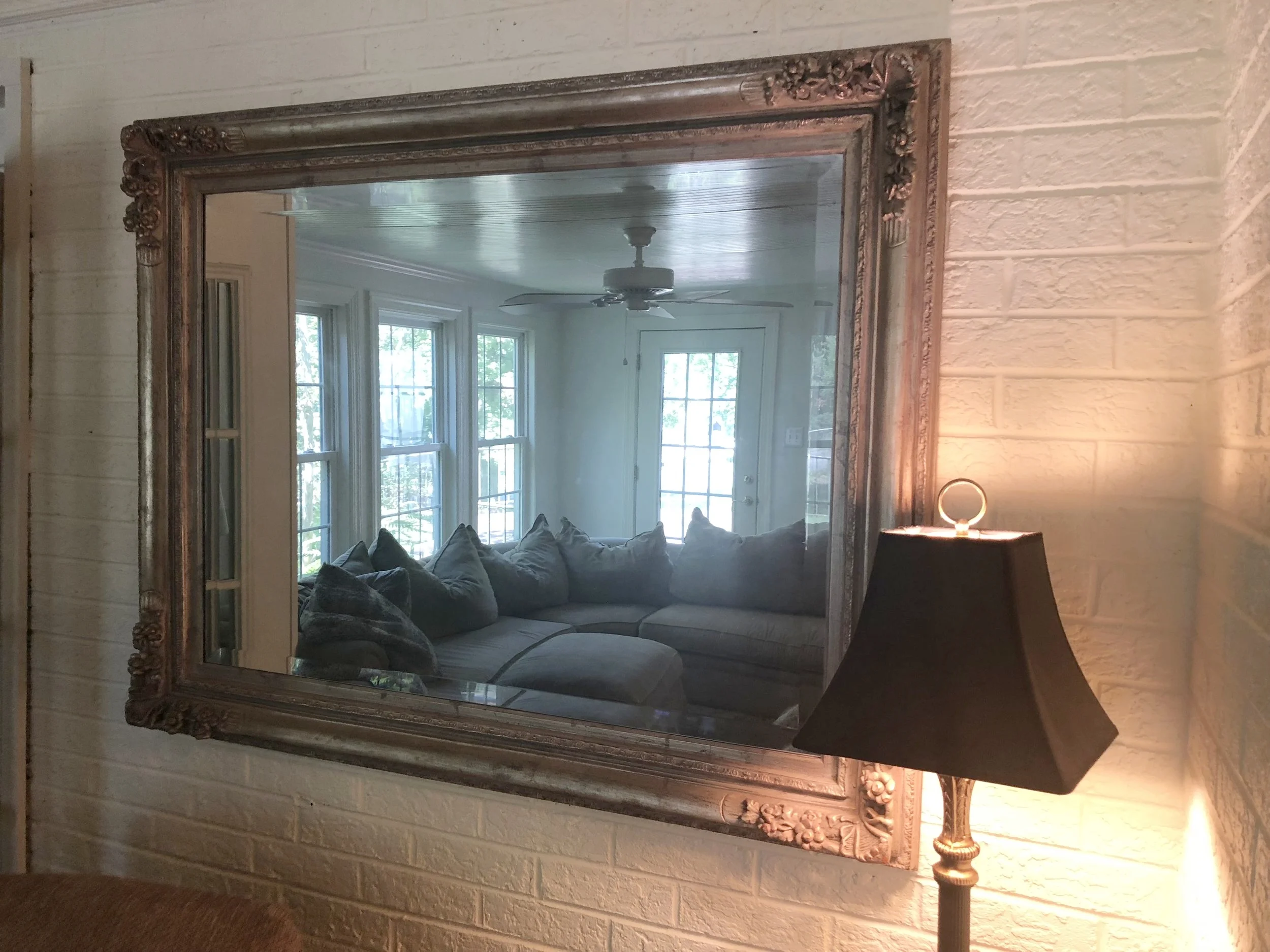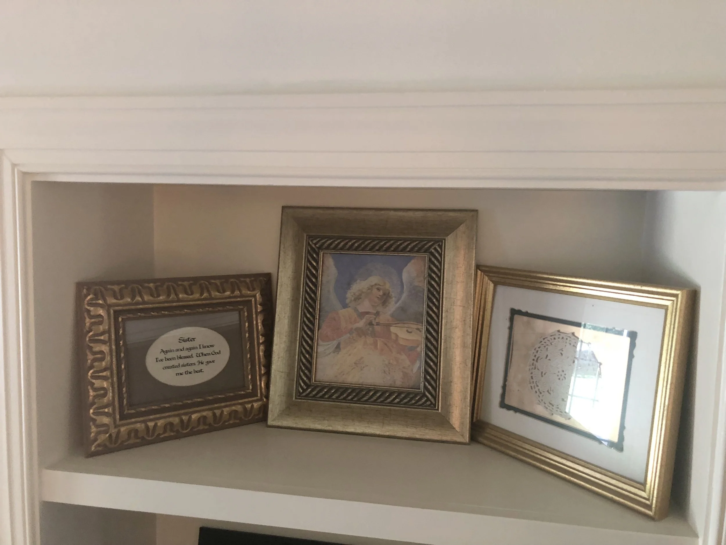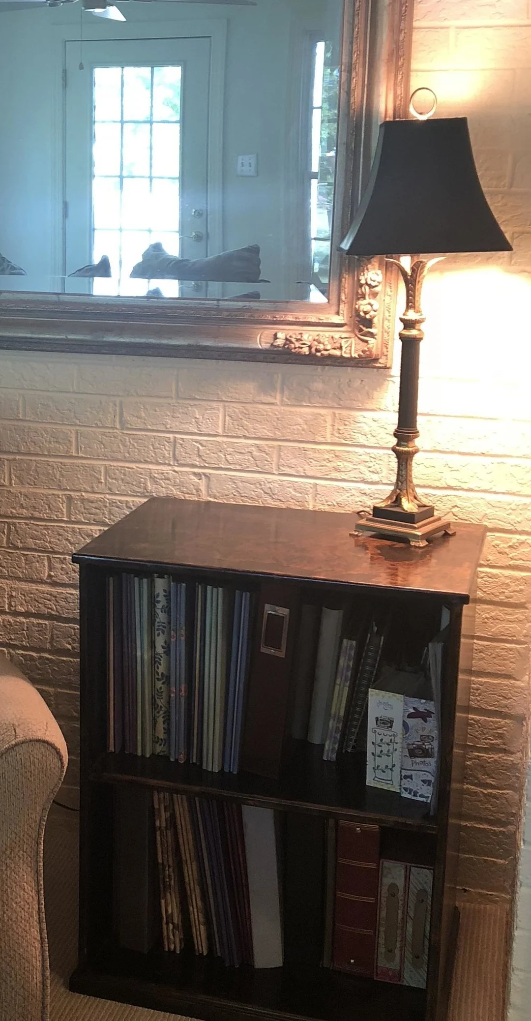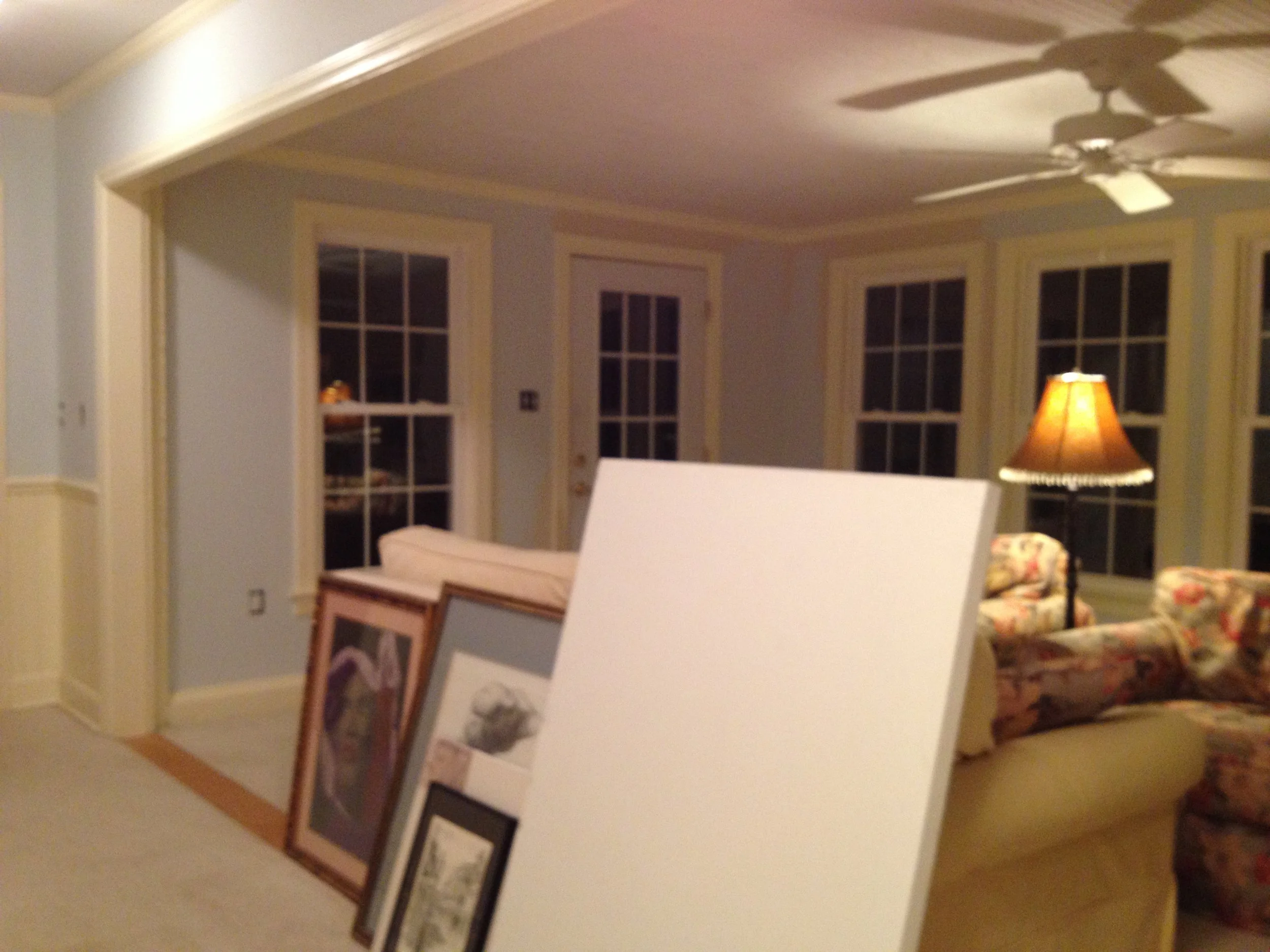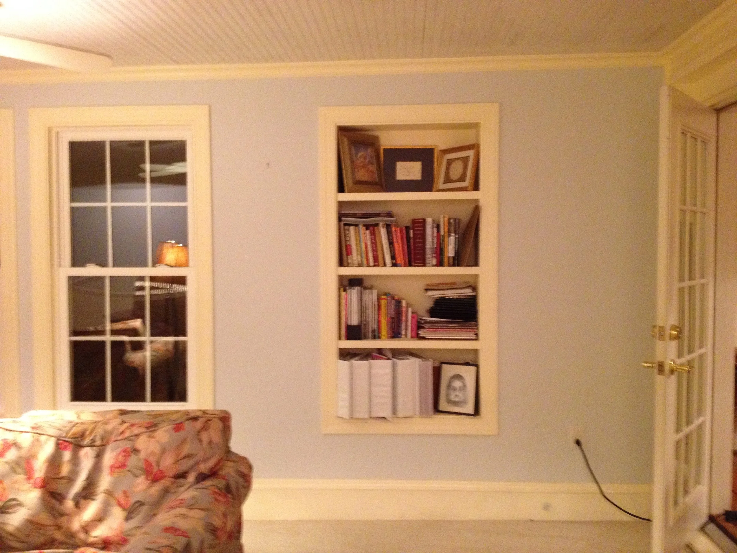 Right now it has an old Rowe sectional we found on Craiglist that was originally intended for the den because it expands to be much larger from the current 9 ft x 9 ft to 9 x 13 ft. It was only purchased due to its large size and is not something I would invest in reupholstering, so when ready, I will be looking for something else. The cream leather chair came from Craigslist as well and Wes said it was the perfect size and although I was less convinced, we bought it, and it has literally been in nearly every room in my home. Nevertheless, I still have it and it fits in the room for now. The end tables are actually nightstands, I repurposed the large dresser from one of the bedrooms and when Mom moved in, we added her recliner and a special bookcase my Daddy made her to hold finished her scrapbooks. There is a nice little built-in bookcase that holds movies and tapes. The light fixture is not really a light fixture, just a cheap fan, and needs to be replaced.
