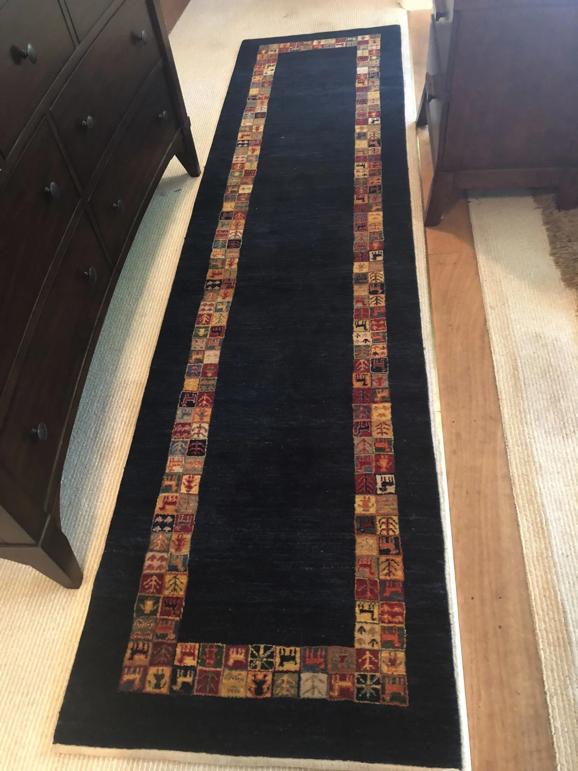 After getting the roof fixed, I plan to redo the flooring to rip out all the carpet that was stained from the five or six years that this home was rented out before we bought it, and add hardwood floors that tie in with the rest of the hardwoods. Right now, we have a large shag rug to cover the stained carpet and and an antique Gabbeh Persian rug runner that we got at auction, that is gorgeous and I will repurpose elswhere when this room is renovated.